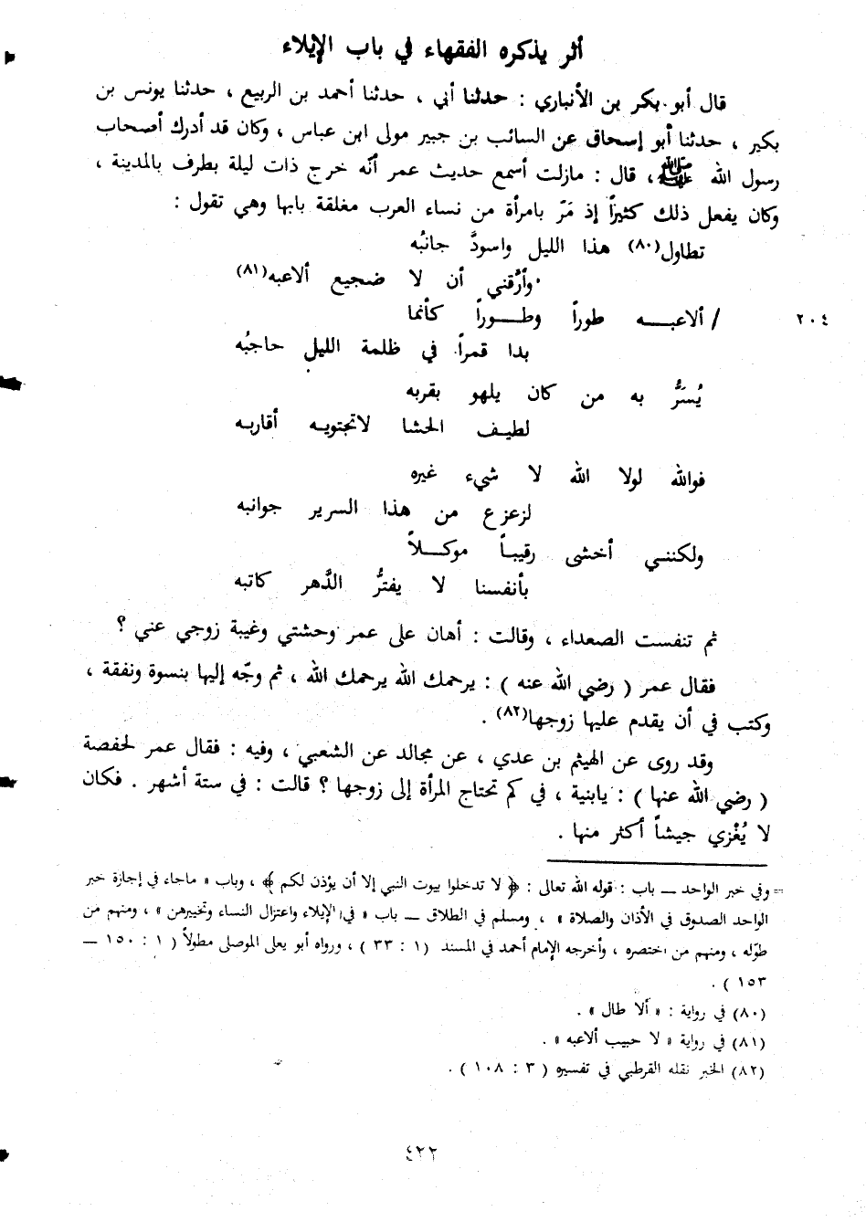 أثر يذكره الفقهاء فى باب الايلاء قال ابو بكر بن الانبارى حدثنا ابى حدثنا احمد بن الربيع حدثنا يونس بن بكير حدثنا ابو اسحاق عن السائب بن جبير مولى ابن عباس وكان قد ادرك اصحاب رسول الله صلى الله عليه وسلم قال مازلت اسمع حديث عمر انه خرج ذات ليلة بطرف بالمدينة وكان يفعل ذلك كثيرا اذ مر بأمرأه من نساء العرب مغلقة بابها وهى تقول تطاول هذا الليل واسود جانبه واورقنى ان لا ضجيع الا عبه الا عبه طورا وطورا كأنمابدا قمرا فى ظلمة الليل جاجبه يسر به من كان يلهو بقربه لطيف الحشا لا تجتويه اقاربه فو الله لولا الله لا شىء غيره لزعزع من هذا السرير جوانبه ولكننى اخشى رقيبا موكلا بأنفسنا لا يفتر الدهر كاتبه ثم تنفست الصعداء وقالت اهان على عمر وحشتى وغيبة زوجى عنى فقال عمر رضى الله عنه يرحمك الله يرحمك الله ثم وجه اليها بنسوة ونفقة وكتب فى ان يقدم عليها زوجها وقد روى عن الهيثم بن عدى عن مجالد عن الشعبى وفيه فقال عمر لحفصة رضى الله عنها يا بنية فى كم تحتاج المراة الى زوجها قالت فى ستة اشهر فكان لا يعزى جيشا أكثر منها