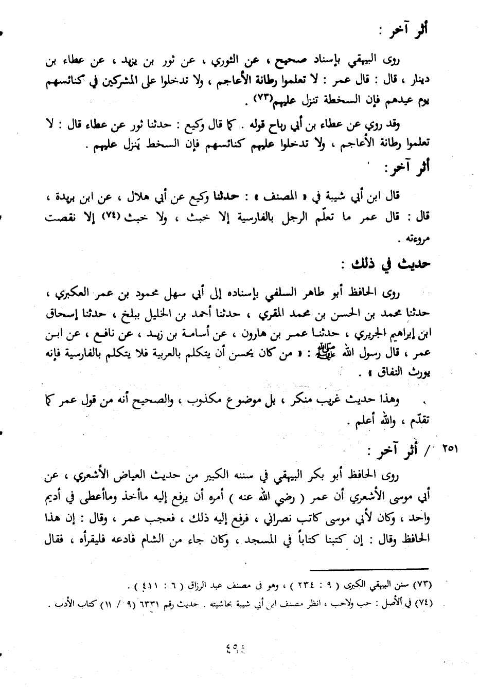 أثر آخر روى البيهقى باسناد صحيح عن الثورى عن ثور بن يزيد عن عطاء بن دينار قال قال عمر لا تعلموا رطانة الاعاجم ولا تدخلوا على المشركين فى كنائسهم يوم عيدهم فإن السخطة تنزل عليهم وقد روى عن عطاء بن ابى رباح قوله كما قال وكيع حدثنا ثور عن عطاء قال لا تعلموا رطانة الاعاجم ولا تدخلوا عليهم كنائسهم فإن السخط ينزل عليهم أثر آخر قال ابن ابى شيبة فى المصنف حدثنا وكيع عن ابى هلال عن ابن بريدة قال قال عمر ما تعلم الرجل بالفارسية الا خبث ولا خبث الا نقصت مروءة حديث فى ذلك روى الحافظ ابو طاهر السلفى باسناده الى ابى سهل محمود بن عمر العكبرى حدثنا محمد بن الحسن بن محمد المقرى حدثنا احمد بن الخليل ببلخ حدثنا اسحاق ابن ابراهيم الجريرى حدثنا عمر بن هارون عن اسامة بن زيد عن نافع عن ابن عمر قال رسول الله صلى الله عليه وسلم من كان يحسن ان يتكلم بالعربية فلا يتكلم بالفارسية فإنه يورث النفاق وهذا حديث غريب منكر بل موضوع مكذوب والصحيح انه من قول عمر كما تقدم والله اعلم أثر آخر روى الحافظ ابو بكر البيهقى فى سننه الكبير من حديث العياض الاشعرى عن ابى موسى الاشعرى ان عمر رضى الله عنه امره ان يرفع اليه ما اخذ وما اعطى فى اديم واحد وكان لأبى موسى كاتب نصرانى فرفع اليه ذلك فعجب عمر وقال ان هذا الحافظ وقال ان كتبنا كتابا فى المسجد وكان جاء كم الشام فادعه فليقرا فقال