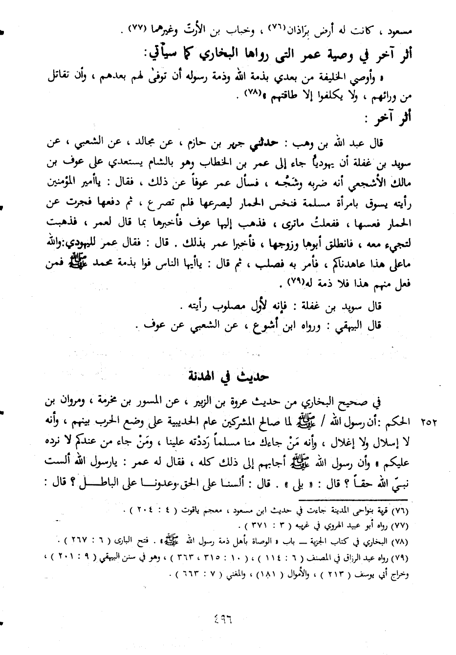 مسعود كانت له ارض براذان وخباب بن الارت وغيرهما أثر آخر فى وصية عمر التى رواها البخارى كما سيأتى واوصى الخليفة من بعدى بذمة الله وذمة رسوله ان توفى لهم بعدهم وان تقاتل من ورائهم ولا يكلفوا الا طاقتهم أثر آخر قال عبد الله بن وهب حدثنى جرير بن حازم عن مجالد عن الشعبى عن سويد بن غفلة ان يهوديا جاء عمر بن الخطاب وهو بالشام يستعدى على عوف بن مالك الاشجعى انه ضربه وشجه فسأل عمر عوفا عن ذلك فقال يا امير المؤمنين رايته يسوق بامراة مسلمة فنخس الحمار ليصرعها فلم تصرع ثم دفعها فجرت عن الحمار فعسها ففعلت ما ترى فذهب اليها عوف فأخبرها بنا قال لعمر فذهبت لتجىء معه فانطلق ابوها وزوجها فاخبرا عمر بذلك قال فقال عمر لليهودى والله ما على هذا عاهدناكم فأمر به فصلب ثم قال يا ايها الناس فوا بذمة محمد صلى الله عليه وسلم فمن فعل منهم هذا فلا ذمة له قال سويد بن غفلة فأنه لأول مصلوب رايته قال البيهقى ورواه ابن اشوع عن الشعبى عن عوف حديث فى الهدنة فى صحيح البخارى من الزبيرعن المسور بن مخرمة ومروان الحكم ان رسول الله صلى الله عليه وسلم لما المركين عام الحديبة على وضع الحرب بينهم وانه لا اسلال ولا اغلال وانه من جاءك منا مسلما رددته علينا ومن جاء ... من عندكم لا نرده عليكم وان رسول الله صلى الله صلى الله عليه وسلم اجابهم الى ذلك كله فقال له عمر يا رسول الله الست نبى الله حقا بلى قال السنا على الحق وعدونا على الباطل قال