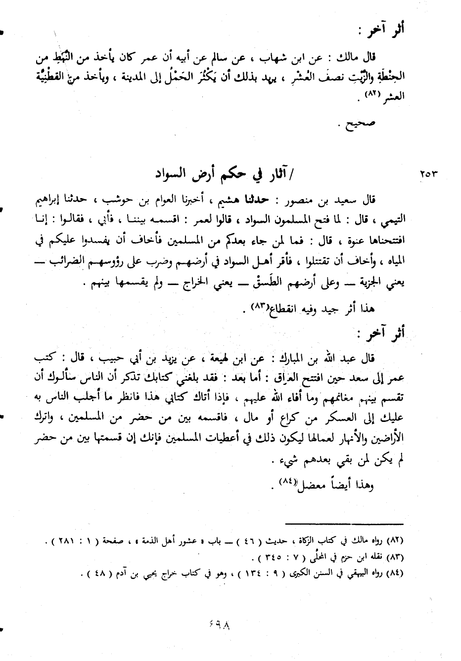 أثر آخر قال مالك عن ابن شهاب عن سالم عن ابيه ان عمر كان يأخذ من النبط من الحنطة والزيت ونصف العشر يريد بذلك ان يكثر الحمل الى المدينة ويأخذ من القطنية العشر صحيح أثار فى حكم ارض السواد قال سعيد بن منصر حدثنا هشيم اخبرنا العوام بن حوشب حدثنا ابراهيم التيمى قال لما فتح المسلمون السواد قالوا قالوا لعمر اقسميه بيننا فأبى فقالوا انا افتتحناها عنوة قال فما لمن جاء بعدكم من المسلمين فأخاف ان يفسدوا عليكم فى المياه واخاف ان تقتتلوا فأقر أهل السواد فى ارضهم وضرب على رؤوسهم الضرائب يعنى الجزية وعلى ارضهم الطسق يعنى الخراج ولم يقسمها بينهم هذا أثر جيد فيه انقطاع أثر آخر قال عبد الله بن المبارك عن ابن لهيعة عن يزيد بن ابى حبيب قال كنت عمر الى سعد حين افتتح العراق اما بعد فقد بلغنى كتابك تذكر ان الناس سالوك ان تقسم بينهم مغانهم وما افاء الله عليهم فإذا اتاك كتابى هذا فانظر ما اجلب الناس به عليك الى العسكر من كراع او مال فاقسمه بين من حضر من المسلمين واترك الاراضين والانهار لعمالها ليكون ذلك فى اعطيات المسلمين فإنك ان قسمتا بين من حضر لم يكن لمن بقى بعدهم بعدهم شىء وهذا ايضا معضل