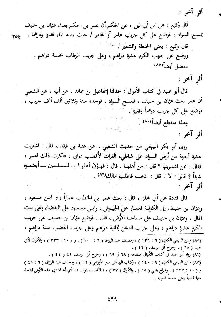 اثر اخر قال وكيع عن ابن ابى ليلى عن الحكم ان عمر بن الحكم بعث عثمان بن جنيف يمسح السواد فوضع على كل جريب عامر او غامر حيث يناله الماء قفيزا ودرهما قال وكيع يعنى الحنطة والشعير ووضع على جريب الكرم عشرة دراهم وعلى جريب الرطاب خمسة دراهم معضل ايضا أثر آخر قال ابو عبيد فى كتاب الاموال حدثنا اسماعيل بن مجالد عن ابيه عن الشعبى ان عمر بعث عثمان بن حنيف فمسح السواد فوجده ستة وثلاثين الف الف جريب فوضع على كل جريب درهما وقفيزا وهذا منقطع ايضا أثر آخر روى ابو بكر البيهقى من حديث الشعبى عن عتبة بن فرقد قال اشتريت عشرة اجربة منارض السواد عاى شاطىء الفرات لاقضب دوالى فذكرت ذلك لعمر فقال ممن اشتريتها قال من اهلها قال فهؤلاء للمسلمين ابعتموه شيئا قالوا لا قال اذهب فاطلب مالك اثر اخر قال قتادة عن ابى مجلز قال بعث عمر بن الخطاب عمارا وابن مسعود وعثمان بن حنيف الى الكوفة فعمار على الجيوش وابن مسعود على القضاء وعلى بيت المال وعثمان بن حنيف على مساحة الارض قال فوضع عثمان بن حنيف على جريب الكرم عشرة دراهم وعلى جريب النخل ثمانية دراهم وعلى جريب القضب ستة دراهم