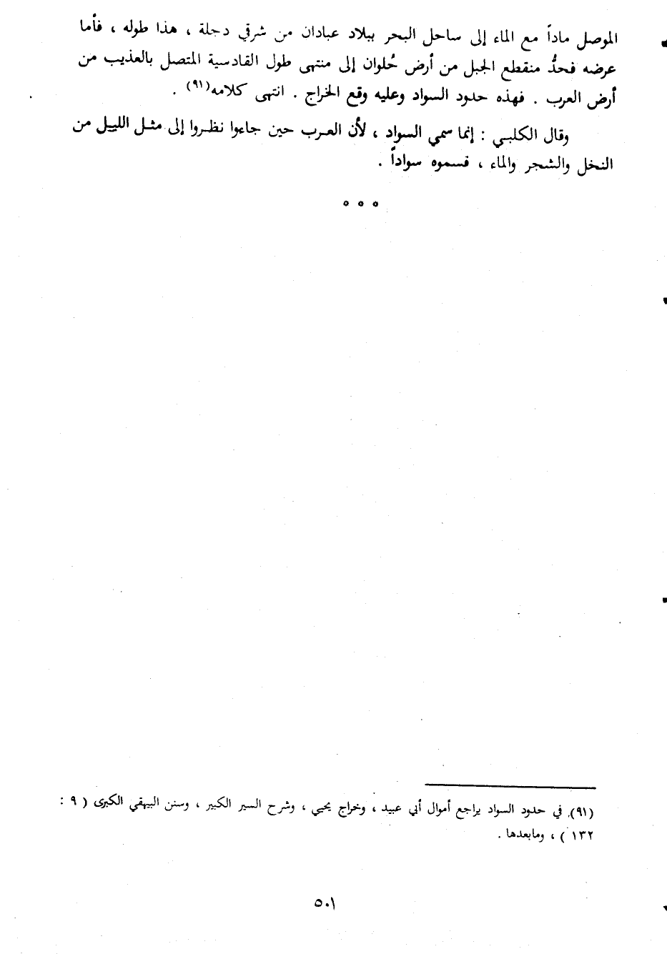 الموصل مادا مع الماء الى ساحل البحر ببلاد عبادان من شرقى دجلة هذا طوله فأما عرضه فحد منقطع الجبل من ارض حلون الى منتهى طول القادسية المتصل بالعذيب من ارض العرب فهذه حدود السواد وعليه وقع الخراج انتهى كلامه وقال الكلبى انما سمى السواد لأن العرب حين جاءوا نظروا الى مثل الليل من النخل والشجر والماء قسموه سوادا