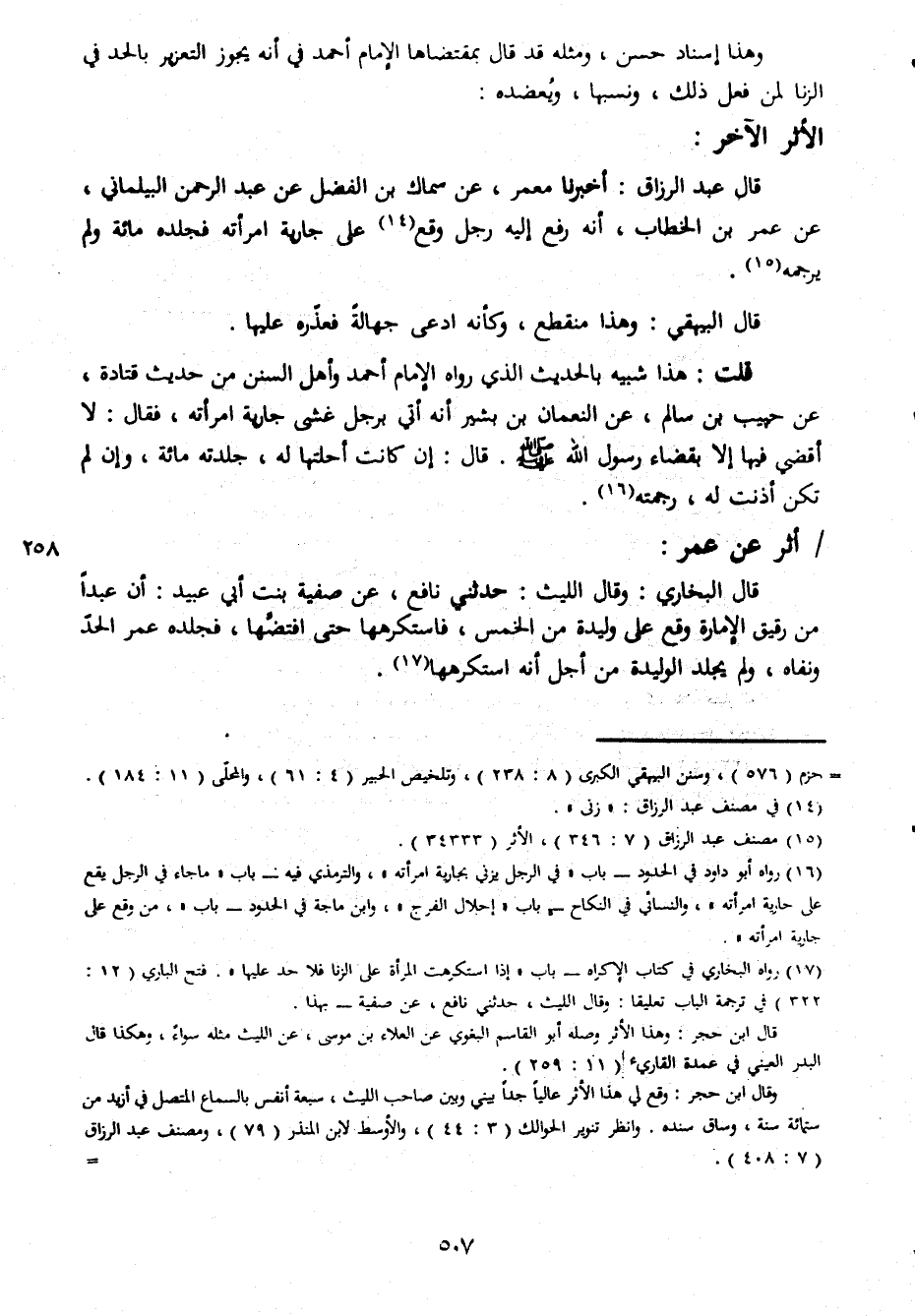 وهذااسناد حسن ومثله قد قال بمقتضاها الامام احمد فى انه يجور التعزير بالحد فى الزنا لمن فعل ذلك ونسبها ويعضده الاثر الاخر قال عبد الرزاق اخبرنا معمر عن سماك بن الفضل عن عبد الرحمن البيلمانى عن عمر بن الخطاب انه رفع اليه رجل وقع على جارية امراته فجلده مائة ولم يرجمه قال البيهقى وهذا منقطع وكأنه ادعى جهالة فعذره مائة ولم يرجمه قال البيهقى وهذا منقطع وكأنه ادعى جهالة فعذره عليها قلت هذا شبية بالحديث الذى رواه الامام احمد وأهل السنن من حديث قتادة عن حبيب بن سالم عن النعمان بن بشير انه اتى برجل غشى جارية امراته فقال لا اقضى فيها الا بقضاء رسول الله صلى الله عليه وسلم قال قال ان كانت احلتها له جلدية مائة وان لم تكن اذنت له رجمته أثر عن عمر قال البخارى قال الليث حدثنى نافع عن صفية بنت ابى عبيد ان عبدا من رقيق الامارة وقع على وليدة من الخمس فاستكرهها حتى افتضها فجلده عمر الحد وتفاه ولم يجلد الوليدة من اجل انه استكرها