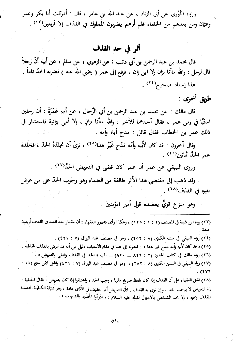 ورواه الثورى عن ابى الزناد عن عبد الله بن عامر قال ادركت ابا بكر وعمر وعثمان ومن بعدهم من الخلفاء فلم ارهم يضربون المملوك فى القذف الا اربعين ظاثر فى حد القذف قال محمد بن عبد الرحمن بن ابى ذئب عن الزهرى عن سالم عن ابيه ان رجلا قال لرجل والله ما انا بزان ولا ابن زان فرفع الى عمر رضى الله عنه فضربه الحد تاما هذا اسناد صحيح طريق قال مالك عن محمد بن عبد الرحمن بن ابى الرجال عن امة عمرة ان رجلين استبا فى زمن عمر فقال احدهما للآخر والله ما انا بزان ولا امى بزانية فاستشار فى ذلك عمر بن الخطاب فقال قائل مدح اباه وامه وقال آخرون قد كان لأبيه وامه مدح غير هذا ونرى ان تجلده الحد فجلده عمر الحد ثمانين وروى البيهقى عن عمر ان عمر كان قضى فى التعريض الحد وقد ذهب الى مقتضى هذاالاثر طائفة من العلماء وهو وجوب الحد على من عرض بغيره فى القذف وهو منزع قوى يعضده قول امير المؤمنين