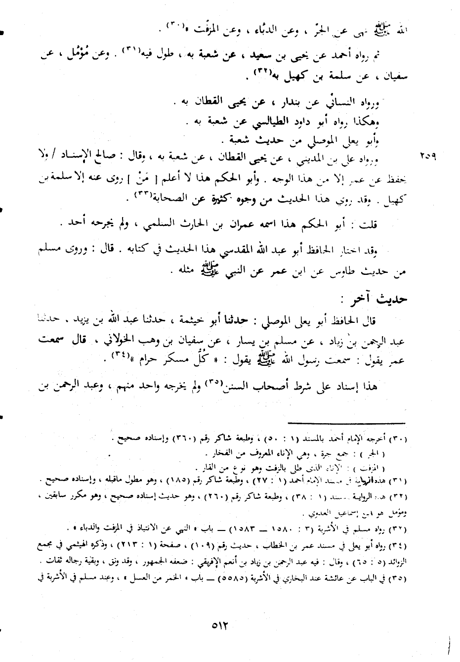 الله صلى الله عليه وسلم نهى عن الجر وعن الدياء وعن المزفت ثم رواه احمد عن يحيى بن سعيد عن شعبة به طول فيه وعن مؤمل عن سفيان عن سلمة بن كهيل به ورواه النسائى عن بندار عن يحيى القطان به وهكذا رواه ابو داود الطيالسى عن شعبة به ووابو يعلى الموصلى من حديث شعبة ورواه على بن المدينى عن يحيى القطان عن شعبة به قال صالح الاسناد ولا يحفظ عن عمر الا من هذا الوجه وابو الحكم هذا لا اعلم من روى عنه الا سلمة بن كهيل وقد روى هذا الحديث من وجوه كثيرة عن الصحابة قلت ابو الحكم هذا اسمه عمران بن الحارث السلمى ولم يخرجه احد وقد اختار الحافظ ابو عبد الله المقدسى هذا الحديث فى كتابه قال وروى مسلم من حديث طاوس عن ابن عمر عن النبى صلى الله عليه وسلم مثله حديث آخر قال الحافظ ابو يعلى الموصلى حدثنا ابو خيثمة حدثنا عبد الله بن يزيد حدثنا عبد الرحمن بن زياد عن مسلم بن يسار عن سفيان بن وهب الخولانى قال سمعت عمر يقول سمعت رسول الله صلى الله عليه وسلم يقول كل مسكر حرام هذا اسناد على شرط اصحاب السنن ولم يخرجه واحد منهم وعبد الرحمن بن