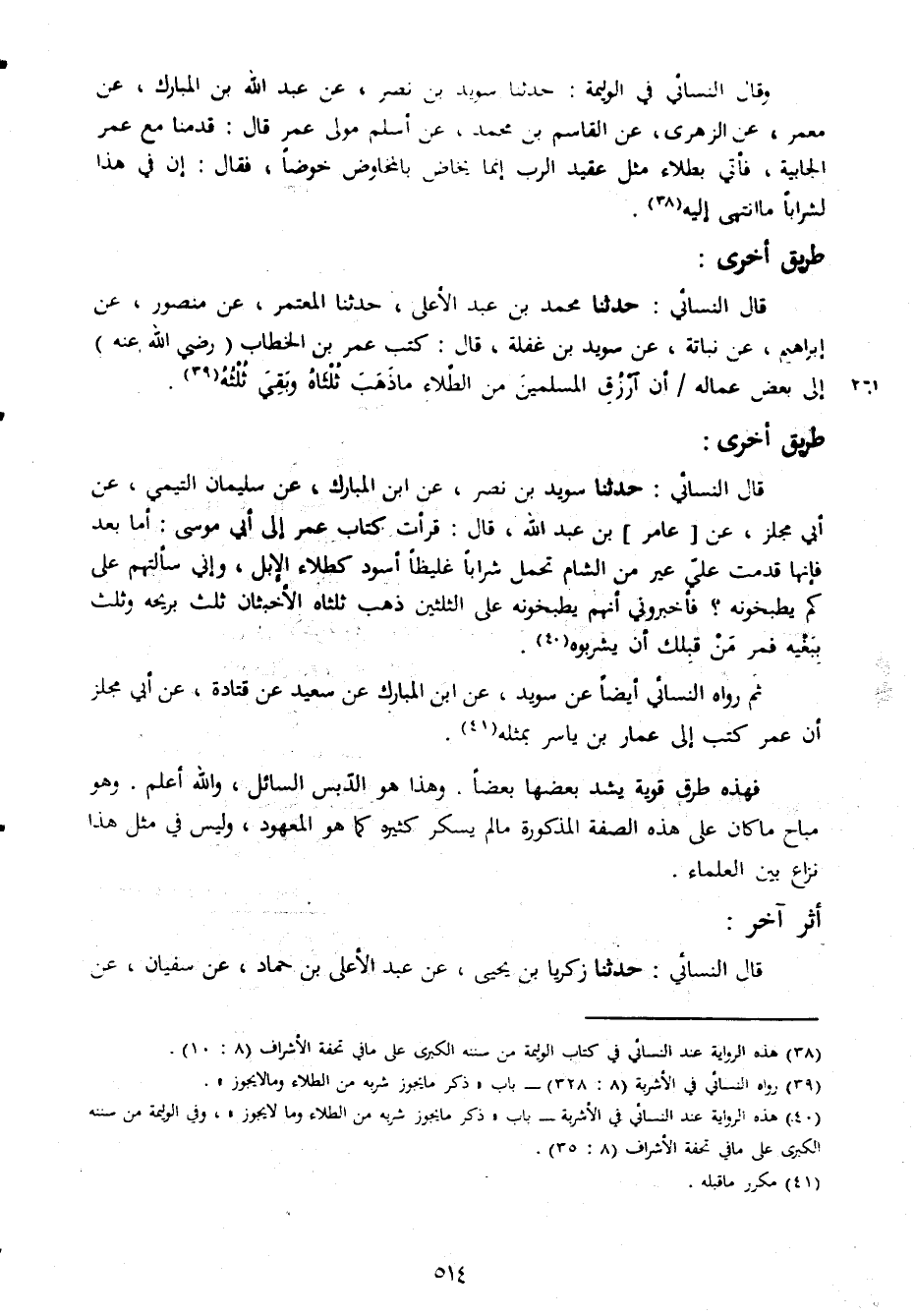 وقال النسائى فى الوليمة حدثنا سويد بن نصر عن عبد الله بن المبارك عن معمر عن الزهرى عن القاسم بن محمد عن اسلم مولى عمر قال قدمنا مع عمر الجابية فأتى بطلاء مثل عقيد الرب انما يخاض بالمخاض خوضا فقال ان فى هذا لشرابا ما انتهى اليه طريق اخرى قال النسائى حدثنا محمد بن عبد الاعلى حدثنا المعتمر عن منصور عن ابراهيم عن نباتة عن سويد بن غفلة كتب عمر بن الخطاب رضى الله عنه الى بعض عناله ان ارزق المسلمين من الطلاء ما ذهب ثلثا وبقى ثلثة طريق اخرى قال النسائى حدثنا سويد بن نصر عن ابن المبارك عن سليمان التيمى عن ابى مجلز عن عامر بن عبد الله قال قرات كتاب عمر الى ابى موسى انا بعد فانها قدمت على عير من الشام تحمل شرابا غليظا اسود كطلاء الابل وانى سالتهم على كم يطبخونه فأخبرونى انهم يطبخونهم على الثلثين ذهب ثلثا الاخبثان ثلث بريحة وثلث ببغية قمر من قلبك ان يشربوه ثم رواه النسائى ايضا عن سويد عن ابن المبارك عن سعيد عن قتادة عن ابى مجل زان عمر كتب الى عمار بن ياسر بمثلة فهذه طرق قوية يشد بعضها بعضا وهذا هو الدبس السائل والله اعلم هو مباح ما كان على هذه الصفة المذكورة مالم يسكر كثيرة كما هو المعهود وليس فى مثل هذا نزاه بين العلماء أثر آخرقال النسائى حدثنا زكريا بن يحيى عن عبد لاعلى بن حماد عن سفيان عن