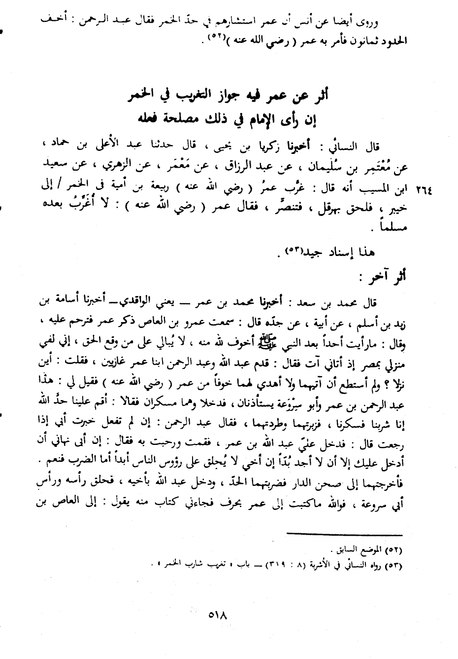 وروى ايضا عن انس ان عمر استشارهم فى الحد الخمر فقال عبد الرحمن اخف الحدود ثمانون فامر به عمر رضى الله عنه أثر عن عمر فيه جواز التغريب فى الخمر أثر عن عمر فيه جواز التغريب فى الخمر ان راى الامام فى ذلك مصلحة فعله قال النسائى اخبرنا زكريا بن يحيى قال حدثنا عبد الاعلى بن حماد عن معتمر بن سليمان عن عبد الرازق عن معمر عن الزهري عن سعيد ابن المسيب انه قال غرب عمر رضي الله عنه ربيعة بن امية فى الخمر الى خبير فلحق بهرقل فننتصر فقال عمر رضى الله عنه لا اغرب بعده مسلما هذا اسناد جيد اثر اخر قال محمد بن سعد اخبرنا محمد بن عمر يعنى الواقدى اخبرنا اسامة بن زيد بن اسلم عن ابيه عن جده قال سمعت عمرو بن العاص ذكر عمر فترحم عليه وقال ما رايت احد بعد النبى صلى الله عليه وسلم اخوف لله منه لا يبالى على من وقع الحق انى لفى منزلى بمصر اذ اتانى ات فقال قدم عبد الله وعبد الرحمن ابنا عمر غازيين فقلت اين نزلا ولم استطع ان اتيهما ولا اهدى لهما خوفا من عمر رضى الله عنه فقيل له هذا عبد الرحمن بن عمر وابو سروعة يستاذنان فدخلا وهما مسكران فقالا اقم علينا حد الله انا شربنا فسكرنا فزيرتهما فقال عبد الرحمن ان لم تفعل خبرت ابى اذا رجعت قال فدخل على عبد الله بن عمرفقمت رحبت به فقال ان ابى نهانى ان ادخل عليك الا ان لا اجد بدا ان اخى لا يلحق على رؤوس الناس ابدا اما الضرب فعم فاخرجهما الى صحن الدار فضربتها الحد ودخل عبد الله باخيه فحلق راسه وراس ابى سروعة فو الله ما كتبت الى عمر بحرف فجاءنى كتاب منه يقول الى العاص بن