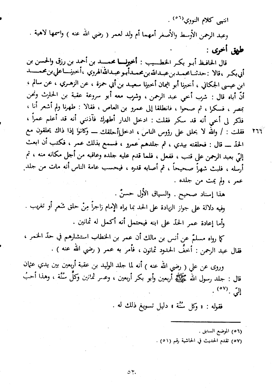 انتهى كلام الثورى وعبد الاوسط والاصغر امهما ام ولد لعمر رضى الله عنه واسمها لاهية طريق اخرى قال الحافظ ابو بكر الخطيب اخبرنا محمد بن احمد بن رزق والحسن بن ابى بكر قالا حدثنا محمد بن عبد الله بن محمد ابو عبد الله الهروى اخبرنا على بن محمد ابن عيسى الجكانى اخبرنا ابو اليمان اخبرنا سعيد بن حمزة عن الزهرى عن سالم ان اباه قال شرب اخى عبد الرحمن وشرب معه ابو سروعة عقبة بن الحارث ونحن بمصر فسكرا ثم صحوا فانطلقا الى عمر بن العاص فقالا طهرنا ولم اشعر انا فذكر لى اخى انه قد سكر فقلت ادخل الداراطهرك فاذتنىانه قد اعلم عمرا فقلت والله لا يحلق على رؤوس الناس ادخل احلقك وكانوا اذا ذاك يحلقون مع الحد قال فحلقته بيدى ثم جلدهم عمرو فسمع بذلك عمر فكتب ان ابعث الى بعبد الرحمن على قتب ففعل فلما قدم عليه جلده وعاقبه من اجل مكانه منه ثم الى بعبد فلبث شهرا صحيحا ثم اصابه قدره فيحتسب عام الناس انه مات من جلد عمر ولم يمت من جلده هذا اسناد صحيح والسياق الاول حسن وفيه دلالة على جواز الزيادة على ابنه فيحتمل انه اكمل له ثمانين كما رواه مسلم عن انس بن مالك ان عمر بن الخطاب استشارهم فى حد الخمر فقال عبد الرحمان اخف الحدود ثمانون فامر به عمر رضى الله عنه وروى عن على رضىالله عنه انه لما جلد الوليد بن عقبة اربعون بين يدى عثما قال جلد رسول الله صلى الله عليه وسلم اربعون واو بكر اربعون وعشرثمانين وكل سنة وهذا احب الى فقوله وكل سنة دليل تسويغ ذلك له