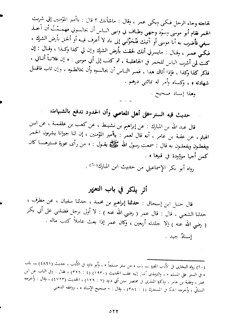 لحاجته وجاء الرجل فبكى وبكى عمر وقال ما شانك قال يا امير المؤمنين انى شربت الخمر فقام ابو موسى وسود وجهى وطاف وبى ونهى الناس ان يجالسونى فهممت ان اخذ سيفى فاضرب ب هابا موسى او اتيك فتحولنى الى باد لا اعرف فيه او الحق بارض الشرك فبكى عمر وقال فايسرنى انك لحقت بارض الشرك وان لى كذا كذا وقال ان كنت لمن اشرب الناس الخمر فى الجاهلية ثقم كتب الى ابى موسى ان فلانا اتانى فذكر كذا كذا فاذا اتاك هذا فمر الناس ان يجالسوه وان يخالطوه وان تاب فاقبل شهادته وكساه وامر له بمائتى درهم وهذا اسناد صحيح حديث فى الستر على اهل المعاصى وان المحدود تدفع بالشبهات قال عبد الله بن المبارك عن ابراهيم بن نشيط عن كعب بن علقمة عن ابن الهيثم عن عقبة بن عامر انه قال لعمر يا امير المؤمنين ان لنا جبرانا يشربون الخمر ويفعلون ويفعلون به قال سمعت رسول الله صلى الله عليه وسلم يقول من راى عورة فسترها كان كمن احيا موؤودة فى قبرها رواه ابو بكر الاسماعيلى من حديث ابن المبارك اثر يذكر فى باب التعزير قال حنبل ابن اسحاق حدثنا ابراهيم بن محمد حدثنا سفيان عن مطرف حدثنا الشعبى قال قال عمر رضى الله عنه لا اوتى برجل فضلنى على ابى بكر رضى الله عنه الا جلدته اربعين وكان عمر اذا بعث عاملا كتب ماله اسناد جيد