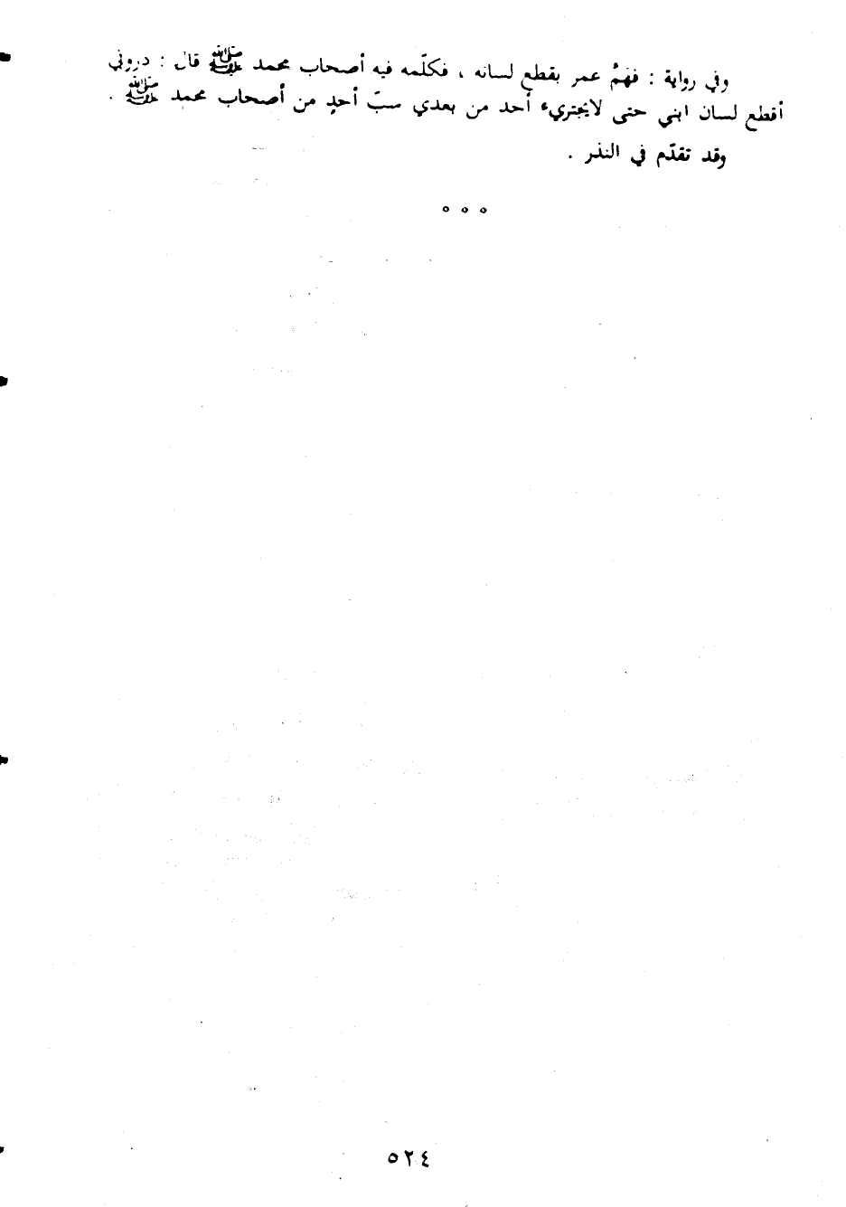 وفى رواية فهم عمر بقطع لسانه فكلمه فيه اصحاب محمد صلى الله عليه وسلم قال ذرونى اقطع لسان ابنى حتى لا يجترىء احد من بعدى سب احد من اصحاب محمد صلى الله عليه وسلم وقد تقدم فى النذر