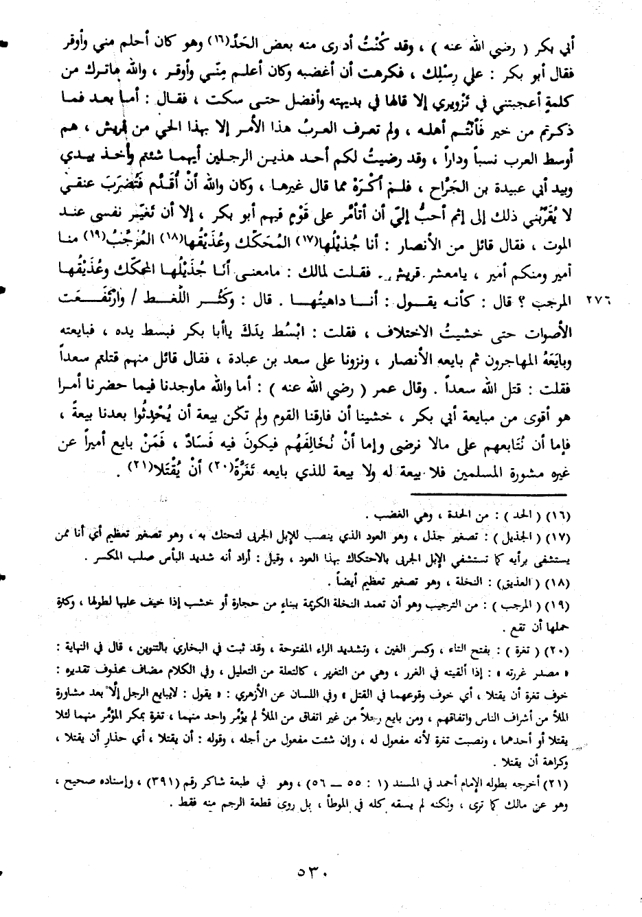 ابى بكر رضى الله عنه وقد كنت ادرى منه بعض الحد وهو كان احلم منى واوقر فقال ابو بكر على رسلك فكرهت ان اغضبه وكان اعلم منى واوقر والله ما ترك من كلمة اعجبتنى فى تزويرى الا قالها فى بديهته وافضل حتى سكت فقال اما بعد فما ذكرتم من فانتم اهله ولم تعرف العرب هذا الامر الا بهذا الحى من قريش هم اوسط العرب نسبا ودارا وقد رضيت لكم احد هذين الرجلين ايهما شئتم واخذ بيدى وبيد ابى عبيدة بن الجراح فلم اكره مما قال غيرها وكان والله ان اقدم فتضرب عنقى لا يقربنى ذلك الى اثم احب الى ان اتامر على قةدزم فيهم ابو بكر الا ان تغير نفسى عند الموت فقال قائل من الانصارى انج ذيلها المحك وعذيقها المرجب قال كانه يقول انا داهيتها قال وكثر اللغط وارتفعت الاصوات حتى خشيت الاختلاف فقلت ابسط يدك يا ابا بكر فبسط يده فبايعته وبايعه المهاجرين ثم بايعه الانصار ونزونا على سعد بن عبادة فقال قائل منهم قتلتم سعدا فقلت قتل الله سعدا وقال عمر رضى الله عنه اما والله ما وجدنا فيما حضرنا امرا هو اقوى من مبايعه ابى بكر خشينا ان فارقنا سالقوم ولم تكن بيعه ان يحدثوا بعدنا بيعه فاما ان نتابعهم على مالا نرضى واما ان نخالفهم فيكون فيه فساد فمن بايع اميرا عن غيره مشهورة المسلمين فلا بيعه للذى بايعه ثغرة ان يقتلا