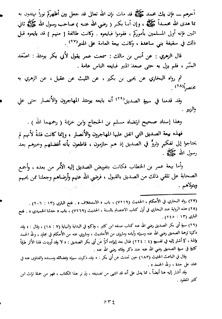 اخرهم فان بك محمد صلى الله عليه وسلم قد مات فان الله تعالى قد حعل بين اظهركم نورا تهتدون به بما هدى الله محمدا صلى الله عليه وسلم وان ابا بكر رضى الله عنه صاحب رسول الله صلى الله عليه وسلم ثانى اثنين فانه اولى المسلمين بامورهم فقوموا فبايعوه وكانت طائفة منهم قد بايعوه قبل ذلك فى سقيفة بنى ساعدة وكانت بيعه العامة على المنبر قال الزهرى عن انس بن مالك سمعت عمر يقول لأبى بكر يومئذ اصعد المنبر فلم يزل به حتى صعد المنبر فبايعه الناس عامة ثم رواه البخارى عن يحيى بن بكير عن الليث عن عقيل عن الزهرى به مختصرا وقد قدمنا فى سيرة الصديق انه بايعه يومئذالمهاجرون والانصار حتى على والزبير وهذا اسناد صحيح ارتضاه مسلم بن الحجاج وابن خزيمة رحمهما الله فهذه بيعة الصديق اذ هم حازمون قاطعون بانه افضلهم وخيرهم بعد رسول الله صلى الله عليه وسلم واما بيعة عمر بن الخطاب فكانت بتفويض الصديق اليه الامر من بعده واجمع الصحابة على تلقى ذلك من الصديق بالقبول فرضى الله عنهم وارضاهم وجعلنا ممن يحبهم ويتولاهم