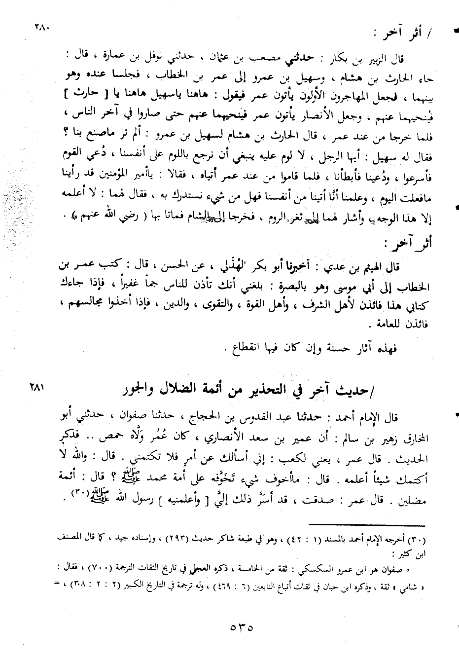 اثر اخر قال الزبير بن بكار حدثنى مصعب بن عثمان حدثنى نوفل بن عمارة قال جاء الحارث بن هشام وسهيل بن عمرو الى عمر بن الخطاب فجلسنا عنده وهو بينهما فجعل المهاجرين الاولون ياتون عمر فيقول هاهنا يا سهيل هاهنا يا حارث فينحميها عنهم وجعل الانصار ياتون عمر فينحميها عنهم حتى صاروا فى اخر الناس فلما خرجا من عند عمر قال الحارث بن هشام لسهيل بن عمرو الم تر ما صنع بنا فقال له سهيل ايها الرجل لا لوم عليه ينبغى ان نرجع بالوم على انفسنا دعى القوم فاسرعوا ودعينا فابطانا فلما قاموا من عند عمر اتياه فقالا يا امير المؤمنين قد راينا ما فعات اليوم وعامنا انا اتينا من انفسنا فهل من شىء نستدرك به فقال لهما لااعلمه الا هنا الوجه واشار لهما الى ثغر الروم فخرجا الى الشام فماتا ب بها رضي الله عنهم اثراخر قال الهيثم بن عدي اخبرنا ابو بكر لهذلي عن الحسن قال كتب عمر بن الخطاب الى ابي موسى وهو بالبصرة بلغني انك تاذن للناس جما غفيرا فاذا جاءك كابي هذا فا ئدة لاهل الشرف واهل القوة والتقوى والدين فاذا اخذوا مجالسهم فائدة للعامة فهذه أثار حسنة وان كان فيها انقطاع حديث آخر فى التحذير من أئمة الضلال والجور قال الامام احمد حدثنا عبد القدوس بن الحجاج حدثنا صفوان حدثنى ابو المخارق زهير بن سالم ان عمير بن سعد الانصارى كان عمر ولاه حمص فذكر الحديث قال عمر يعنى لكعب انى اسالك عن امر فلا تكتمنى قال والله لا اكتملك شيئا اعلمه قال ما اخوف شىء تخوفه على امة محمد صلى الله عليه وسلم قال أئمة مضلين قال عمر صدقت قد اسر ذلك الى واعلمنيه رسول الله صلى الله عليه وسلم