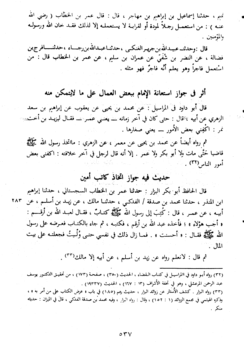 تميم حدثنا اسماعيل بن ابراهيم بن مهاجر قال قال عمر بن الخطاب رضى الله عنه من استعمل رجلا لمودة او لقرابة لا يستعمله الا لذلك فقد خان الله ورسوله والمؤمنين قال وحدثت عبيد الله بن جرير الغنكى حدثنا عبد الله بن رجاء حدثنا فرج بن فضالة عن النضر بن شفى عن عمران بن سليم عن عمر بن الخطاب قال من استعمل فاجرا وهو يعلم انه فاجر فهو مثله أثر فى جواز استعانة الامام ببعض العمال على ما لا يتمكن منه قال الو داود فى المراسيل عن محمد بن يحيى عن يعقوب عن ابراهيم بن سعد الزهرى عن ابيه قال حتى كان فى اخر زمانه يعنى عمر فقال ليزيد بن اخت نمر اكفنى بعض الامور يعنى صغارها ثم رواه ايضا عن محمد بن يحيى عن معمر عن الزهرى ما اتخذ رسول الله صلى الله عليه وسلم قاضيا حتى مات ولا ابو بكر ولا عمر الا انه قال لرجل فى آخر خلافته اكفنى بعض امور الناس حديث فيه جواز اتخاذ كاتب امين قال الحافظ ابو بكر البزار حدثنا عمر بن الخطاب السجستانى حدثنا ابراهيم ابن المنذر حدثنا محمد بن صدقة الفدكى حدثنا مالك عن زيد بن اسلم عن ابيه عن عمر قال كتب الى رسول الله صلى الله عليه وسلم كتاب فقال لعبد الله بن ارقم اجب هؤلاء فاخذه عبد الله بن ارقمفكتبه ثم جاء بالكتاب فعرضه على رسول الله صلى الله عليه وسلم فقال احسنت فما زال ذلك في نفسي حتى وليت فجعلته على بيت المال ثم قال لا نعلم رواد عن زيد بن اسلم عن ابيه الا مالك