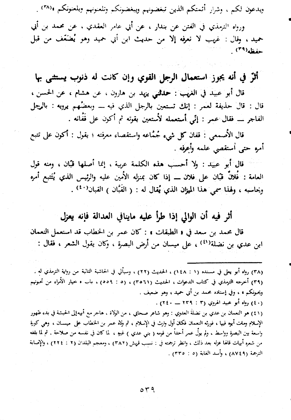 ويدعون لكم وشرار ائمتكم الذين تبغضونهم ويبغضونكم وتلعنونهم ويلعنوكم ورواه الترمذى فى الفتن عن بندار عن ابى عامر العقدى عن محمد بن ابى حميد وقال غريب لا نعرفه الا من حديث ابن ابى حميد وهو يضعف من قبل حفظه ظاثر فى انه يجوز استعمال الرجل القوى وان كانت له ذنوب يستتنى بها قال ابو عبيد فى الغريب حدثنى يزيد بن هارون عن هشام عن الحسن قال قال حذيفة لعمر انك تستعين بالرجل الذى فيه وبعضهم يرويه بالرجل الفاجر فقال عمر انى استعمله لاسبعين بقوته ثم اكون على قفانة قال الاصمعى فقان كل شىء جماعة واستقصاء معرفته يقول اكون على تتبع امره حتى استقصى علمه واعرفه قال ابو عبيد ولا احسب هذه الكلمة عربية انما اصلها قبان ومنه قول العامة فلان قبان على فلان اذا كان بمنزله الامين عليه والرئيس الذى يتتبع امره ويحاسبه ولهذا سمى هذا الميزان الذى يقال له القبان القبان أثر فيه اذا طرا عليه ما ينافى العدالة فانه يعزل قال محمد بن سعد فى الطبقات كان عمر بن الخطاب قد استعمل النعمان ابن عدى بن نضلة على ميسان من ارض البصرة ومان يقول الشعر فقال