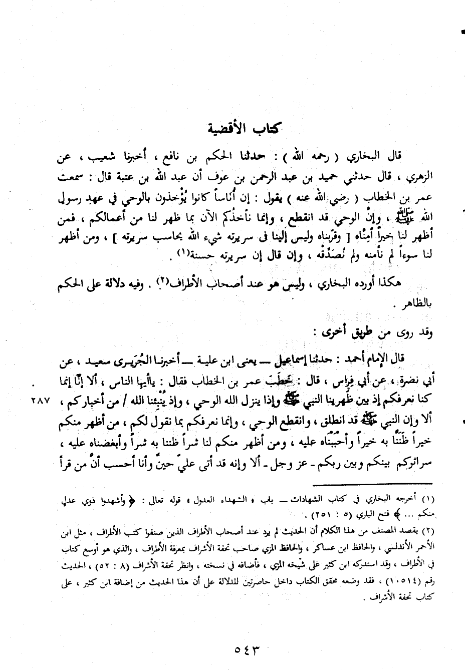 قال البخارى رحمه الله حدثنا الحكم بن نافع اخبرنا شعيب عن الزهرى قال حدثنى حميد بن عبد الرحمن بن عوف ان عبد الله بن عتبة قال سمعت عمر بن الخطاب رضى الله عنه يقول ان اناسا كانوا يؤخذون بالوحى فى عهد رسول الله صلى الله عليه وسلم وان الوحى قد انقطع وانما ناخذكم الان بما ظهرلنا من اعمالكم فمن اظهر لنا خيرا امناه وقربناه وليس الينا في سريرته شئ الله يحاسب سريرته ومن اظهر لنا سواء لم نامنه ولم نصدقه وان قال ان سريرته حسنة هكذا اورد البخاري وليس هو عند اصحاب الاطراف وفيه دلالة على الحكم بالظاهر وقد روى من طريق اخرى قال المام احمد حدثنا اسماعيل يعني ابن علية اخبرنا الجريرى سعيد عن ابينضرة عن ابي فراس قال خطب عمر بن الخطاب فقال ايها الناس الا انا انما كنا نعرفكم اذ بين ظهرينا النبى صلى الله عليه وسلم واذا ينزل الله الوحى واذا ينبنا الله من اخباركم الا وان النبى صلى الله عليه وسلم قد انطلق وانقطع وانقطع الوحى وانما نعرفكم بما نقول لكم من اظهر منكم خيرا ظننا به خيرا واحببناه عليه ومن أظهر منكم لنا شرا ظننا به شرا وابغضناه عليه سرائركم بينكم وبين ربكم عزوجل الا وانه قد اتى على حين وانا احسب ان من قرا