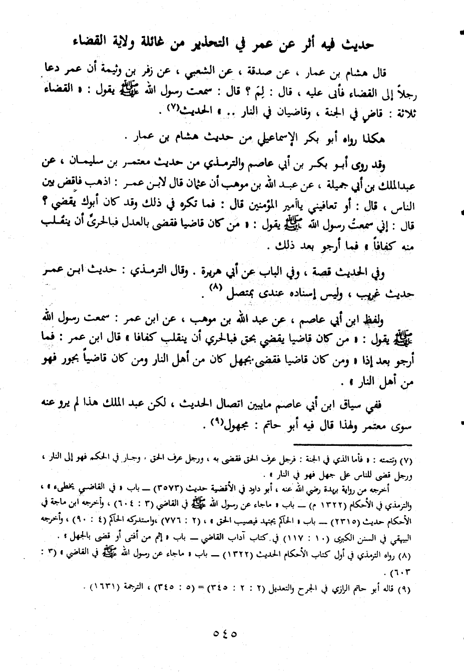 حديثفيه اثر عمر في التحذير من غائلة ولاية القضاء قال هشام بن عمار عن صدقة عن الشعبي عن زفر بن وثيمة ان عمر دعا رجلا الى القضاء فابى عليه قال لمك قال سمعت رسول الله صلى الله عليه وسلم يقول القضاء ثلاثة قاضى في الجنة وقاضيان في النار الحديث هشام بن عمار وقد روى ابوبكر بن ابي عاصم والترمذي من حديث معتمربن سليمان عن عبد الملك بن ابي جميلة عن عبد الله بن موه بان عثمان قال لابن عمر اذهب فاقض بين الناس قال او تعافيني ياامير المؤمنين قال فما تكره في ذلك وقد كان ابوك يقضي قال ءاني سمعت رسول الله صلىالله عليه وسلم يقول من كان قاضيا فقض بالعدل فبالحرى ان ينقلب منه كفافا فما ارجو بعد ذلك وفي الحديث قصة وفي الباب عن ابي هريرة وقال الترمذي حديث ابن عمر حديث غريب وليس ءاسناده عندى بمتصل ولفظ ابن ابي عاصم عن عبد الله بن موهب عن ابن عمر سمعت رسول الله صلى الله عليه وسلم يقول من كان قاضيا يقضى بحق فالبلحرى ان ينقلب كفافا قال ابن عمر فما ارجو بعد اذا ومن كان قاضيا فقضى بجهل كان من اهل النار ومن كان قاضيا بجور فهو من اهل النار ففى سياق ابن ابى عاصم ما بين اتصال الحديث لكن عبد الملك هذا لم يرو عنه سوى معتمر ولهذا قال فيه ابو حاتم مجهول