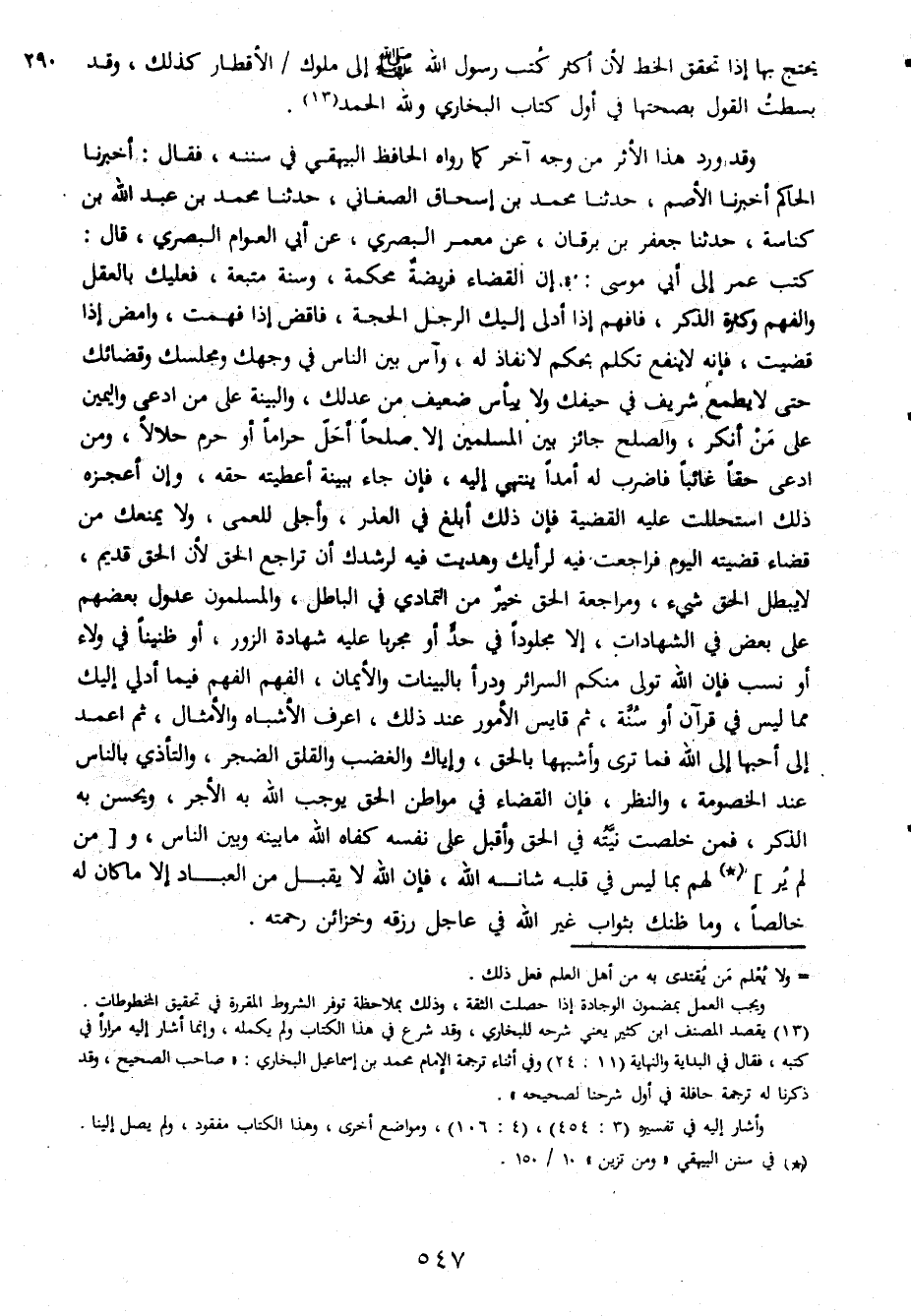 يحتج بها اذا تحقق الخط لان اكثر كتب رسول الله صلى الله عليه وسلم الى الملوك الاقطار وقد بسطت القول بصحتها فى اول كتاب البخارى ولله الحمد وقد رودت هذا الاثر من وجه اخر كما رواه الحافظ البيهقى فى سننه فقال اخبرنا الحاكم اخبرنا الاصم حدثنا محمد بن اسحاق الصغانى حدثنا محمد بن عبد الله بن كناسة حدثنا جعفر بن برقاون عن معمر البصرى عن ابى العوام البصرى قال كتب عمر الى ابى موسى ان القضاء فريضة محكمة وسنة متبعة فعليك بالعقل والفهم وكثرة الذكر فافهم اذا ادلى اليك الرجل الحجة فاقض اذا فهمت وامض اذا قضيت فاءنه لاينفع تكلم بحكم لانفاد له واس بين الناس في وجهك وقضائك حتى لايطمع شريف في حيفك ولايياس ضعيف من عدلك والبينة على من ادعى واليمين على من انكر والصلح جائز بين المسلمين ءالاصلحا احل حراما او حرم حلالا ومن ادعى حقا غائبا فاضرب له امدا ينتهي اليه فان جاء ببينة اعطيته حقه وان اعجزه ذلك استحللت عليه القضية فان ذلك ابلغ في العذر واجلى للعمى ولاينعك من قضاء قضيته اليوم فراجعت فيه لرايك وهديت فيه لرشدك ان تراجع الحق لان الحق قديم لايبطل الحق شيء ومراجعة الحق خير من التمادي في الباطل والمسلمون عدول بعضهم على بعض في الشهادات الامجلودا في حداومجربا عليه شهادة الزور او ظنينا في ولاء او نسب فان الله تولى منكم السرائر ودرا بالبينات والامور عند ذلك اعرف الاشباه الامثال ثم اعمد الى احبها الى الله فما ترى واشبهها بالحق واياك والغضب والقلق والضجر والتاذى بالناس عند الخصومة والنظر فان القضاء فى مواطن الحق يوجب الله به الاجر ويحسن به الذكر فمن خلصت نيته فى الحق واقبل على نفسه كفاة الله ما بينه وبين الناس ومن لم لهم بما ليس فى قلبه شانه الله فان الله لا يقبل من العباد الا ما كان له خالصا وما ظنك بثواب غير الله فى عاجل رزقه وخزائن رحمته