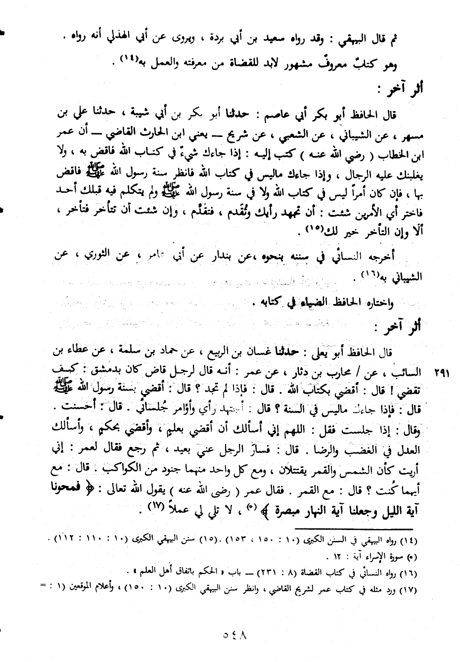 ثم قال البيهقى وقد رواه سعيد بن ابى بردة ويروى عن ابى الهذلى انه رواه وهو كتاب معروف مشهور لا بد للقضاة من معرفته والعمل به اثر اخر قال الحافظ ابو بكر ابى عاصم حدثنا ابو بكر بن ابى شيبة حدثنا على بن مسهر عن الشيبانى عن شريح يعنى ابن الحارث القاضى ان عمر ابن الخطاب رضى الله عنه كتب اليه اذا جاءك شئ فى كتاب الله فاقض به ولا يغلبنك عليه الرجال واذا جاءك ماليس فى كتاب الله فانظر سنة رسول الله صلى الله عليه وسلم فاقض بها فان كان امرا ليس فى كتاب الله ولا فى سنة رسول الله صلى الله عليه وسلم ولم يتكلم فيه قبلك احد فاختر اى الامرين شئت ان تجتهد رأيك وتقدم فتقدم وان شئت ان تتأخر فتأخر الا وان التأخر خير لك اخرجه النسائى فى سننه بنحوه عن بندار عن ابى عامر عن الثورى عن الشيبانى به واختاره الحافظ الضياء فى كتابه اثر اخر قال الحافظ ابو يعلى حدثنا غسان بن الربيع عن حماد بن سلمة عن عطاء بن السائب عن محارب بن دثار عن عمر انه قال لرجل قاض كان بدمشق كيف تقضى قال اقضى بكتاب الله قال فاذا لنم تجد قال اقضى بسنة رسول الله صلى الله عليه وسلم قال فاذا جاءك ماليس فى السنة قال اجتهد رأى واوامر جلسائى قال احسنت وقال اذا جلست فقل اللهم انى اسأل كان اقضى بعلم واقضى بعلم واقضى بحكم واسألك العدل فى الغضب والرضا قال فسار الرجل عنى بعيد ثم رجع فقال لعمر انى اريت كأن الشمس والقمر يقتتلان ومع كل واحد منهما جنود من الكواكب قال مع ايهما كنت قال مع القمر فقال عمر رضى الله عنه يقول الله تعالى فمحونا اية الليل وجعلنا اية النهار مبصرة لاتلى لى عملا