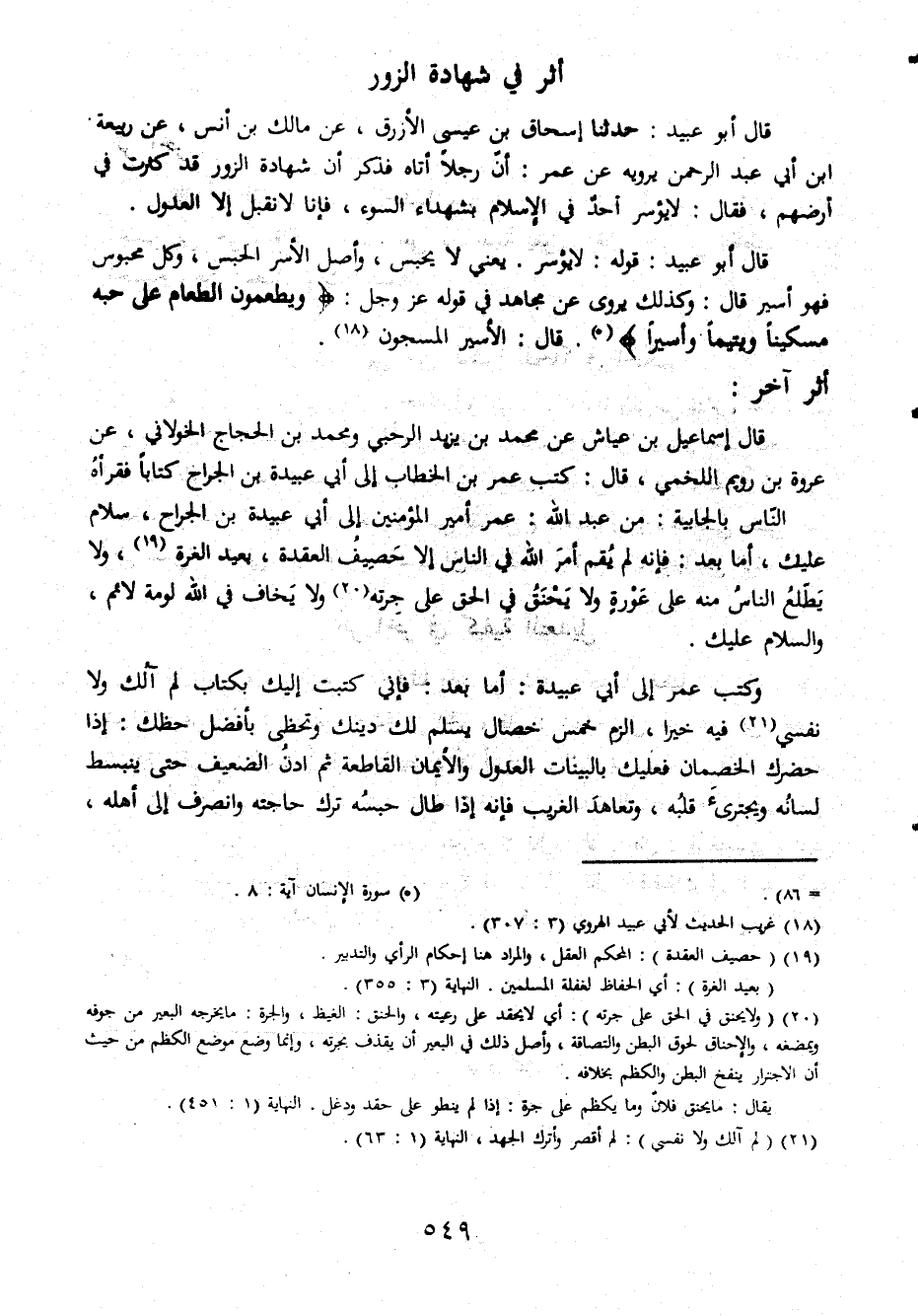 اثر ابو عبيد حدثنا اسحاق بن عيسى الازرق عن مالك بن انس عن ربيعة ابن ابى عبد الرحمن يرويه عن عمر ان رجلا اتاه فذكر ان شهادة الزور قد كثرت فى ارضهم فقال لا يؤسر احد فى الاسلام بشهداء السوء فانا لانقبل الا العدول قال ابو عبيد قوله لا يؤسر يعنى لا يحبس واوصل الاسر الحبس وكل محبوس فهو اسير قال وكذلك يروى عن مجاهد فى قوله عزوجل ويطمعون الطعام على حبه مسكينا ويتيما واسيرا قال الاسير المسجون اثر اخر قال اسماعيل بن عياش عن محمد بن يزيد الرحبى ومحمد بن الحجاج الخولانى عن عروة بن رويم اللخمى قال كتب عمر بن الخطاب الى ابى عبيدة بن الجراح كتابا فقرأه الناس بالجابية من عبد الله عمر امير المؤمنين الى ابى عبيدة بن الجراح سلام عليك اما بعد فانه لم يقم امر الله فى الناس الا حصيب العقدة بعيد الغرة ولا بطلع الناس منه على عورة ولا يحق على جرته ولا يخاف فى الله لومة لائم والسلام عليك وكتب عمر الى ابى عبيدة اما بعد فانى كتبت اليك بكتاب لم الك ولا نفسى فيه خيرا الزم خمس خصال يسلم لك دينك وتحطى بأفضل حظك اذا حضرك الخصمان فعليك بالبينات العدول والايمان القاطعة ثم ادن الضعيف حتى ينبسط لسانه ويجترئ قلبه وتعاهد الغريب فانه اذا طال حبسه ترك وانصرف الى اهله