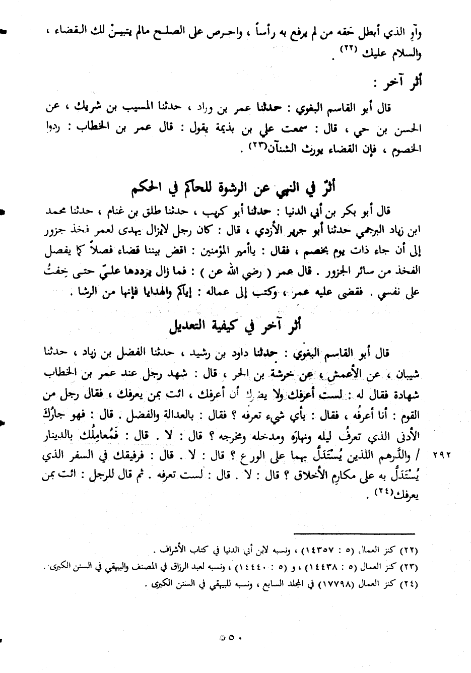 واو الذي ابطل حقه من لم يرفع ب هراسا واحرص على الصلح مالم يتبين لك القضاء والسلام عليك اثراخر قال ابو القاسم البغوي حدثنا عمربن وراد حدثنا المسيب بن شريك عن الحسن بن حى قال سمعت على بن بذيمة يقول قال عمر بن الخطاب ردوا الخصوم فان القضاء يورث الشنان اثر فى النهى عن الرشوة للحاكم فى الحكم قال ابو بكر بن ابى الدنيا حدثنا ابو كريب حدثنا طلق بن غنام حدثنا محمد ابن زياد البرجمى حدثنا ابو جرير الازدى قال كان رجل لا يزال يهدى لعمر فخذ جزور قال عمر رضى الله عن فما زال يرددها على حتى خفت على نفسى فقضى عليه عمر وكتب الى عماله اياكم والهدايا فانها من الرشا أثر اخر فى كيفيه التعديل قال ابو قاسم البغوى حدثنا داود بن رشيد حدثنا الفضل بن زياد حدثنا شيبان عن الاعمش عن خرشة بن الحر قال شهد رجل عند عمر بن الخطاب شهادة فقال له لست اعرفك ولا يضرك ان اعرف كانت بمن يعوفك فقال رجل من القوم انا اعرفك فقال باي شيء تعرفه فقال بالعدالة والفضل قال فهو جارك الادنى الذي تعرف ليله ونهاره ومدخله مخرجه قال لا قال فمعاملك بالدينار والدرهم اللذين يستدل بهما على الورع قال لا قال فرفيقك في السفر الذي يستدل به على مكارم الاخلاق قال لا لست تعرفه ثم قال للرجل ائت بمن يعرفك