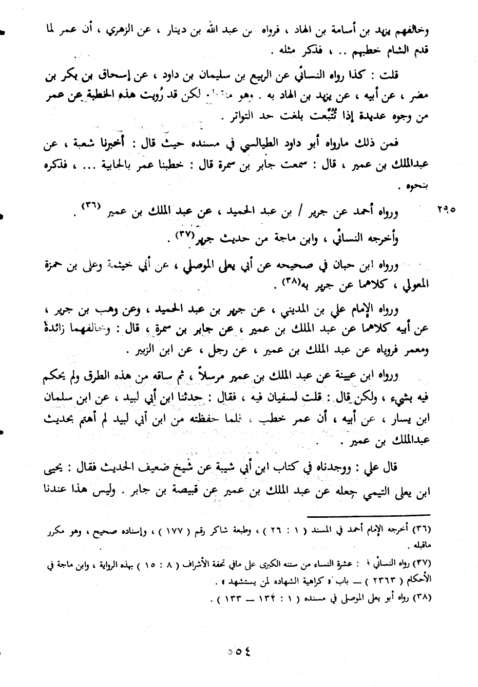 وخالفهم يزيد بن اسامة بن الهاد فرواه عن عبد الله بن دينار عن الزهرى ان عمر لما قدم الشام خطبهم فذكر مثله قلت كذا رواه النسائى عن الربيع بن سليمان بن داود عن اسحاق بن بكر بن مضر عن ابيه عن يزيد بن الهاد به وهو منقطع لكن قد رويت هذه الخطبه عن عمر من وجوه عديدة اذا تتبعت بلغت حد التواتر فمن ذلك ما رواه ابو داود الطيالسى فى مسنده حيث قال اخبرنا شعبة عن عبد الملك بن عمير قال سمعت جابر بن سمرة قال خطبنا عمر بالجابية فذكره بنحوه ورواه احمد عن جرير بن عبد الحميد عن عبد الملك بن عمير واخرجه النسائى وابن ماجة من حديث جرير ورواه ابن حبان فى صحيحه عن ابى يعلى الموصلى عن ابى خيثمة وعلى بن حمزة المعولى كلاهما عن جرير به ورواه الامام على بن المدينى عن جرير بن عبد الحميد وعن وهب بن جرير عن ابيه كلاهما عن عبد الملك بن عمير عن جابر بن سمرة قال وخالفهما زائدة ومعمر فروياه عن عبد الملك بن عمير عن رجل عن ابن الزبير ورواه ابن عيينة عن عبد الملك بن عمير مرسلا ثم ساقة منهذه الطرق ولم يحكم فيه بشىء ولكن قال قلت لسفيان فيه فقال حدثنا ابن ابى لبيد عن ابن سليمان ابن يسار عن ابيه ان عمر خطب فلما حفظته منابن ابى لبيد لم اهتم بحديث عبد الملك بن عمير قال على ووجدناه فى كتاب ابن ابى شيبة عن شيخ ضعيف الحديث فقال يحيى ابن يعلى التيمى جعله عن عبد الملك بن عمير عن قبيصة بن جابر وليس هذه عندنا