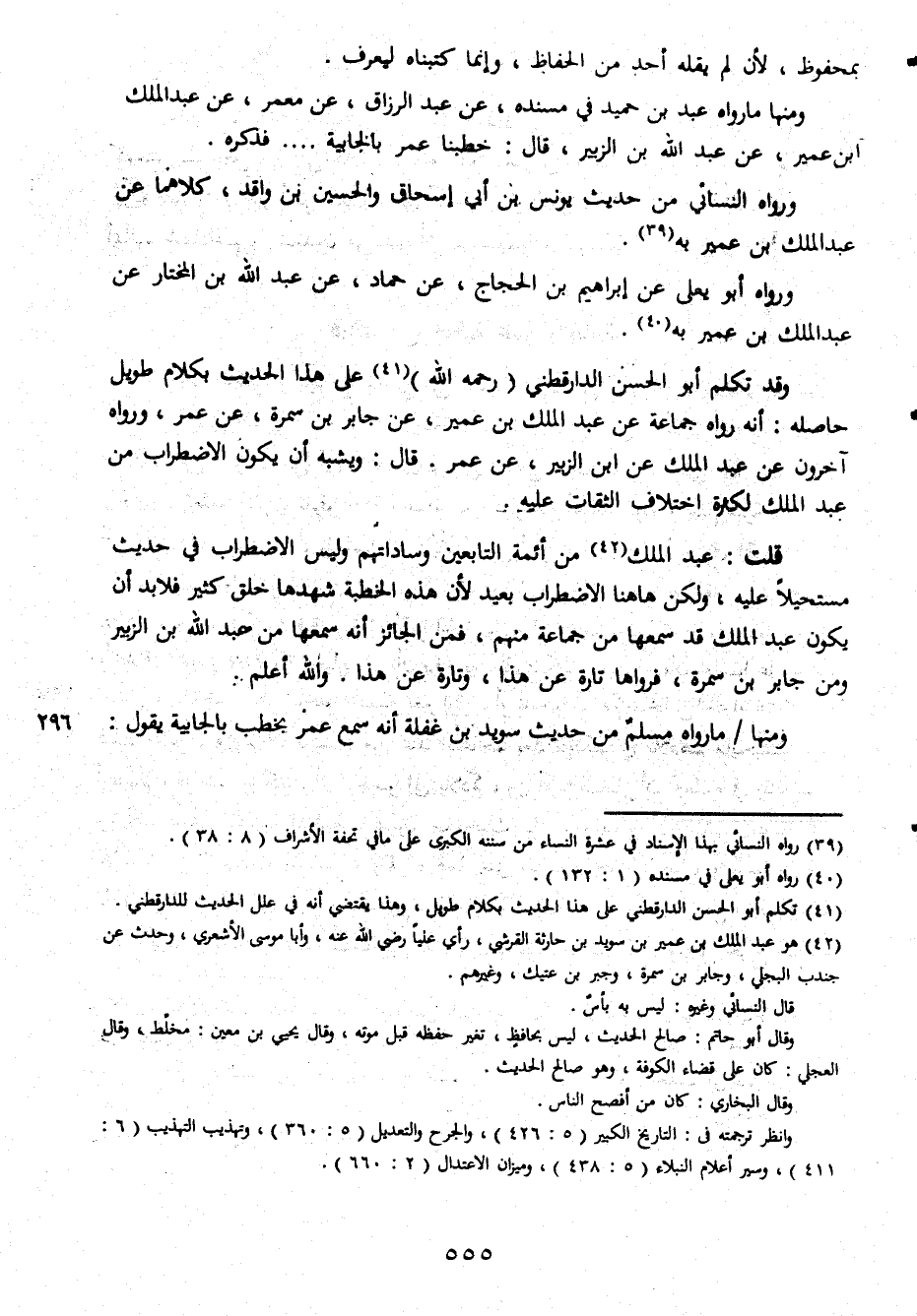 بمحفوظ لأن لم يقله احد من الحفاظ وانما كتبناه ليعرف ومنها ما رواه عبد بن حميد فى مسنده عن عبد الرزاق عن معمر عن عبد الملك ابنعمير عن عبد الله بن الزبير قال خطبنا عمر بالجابية فذكره ورواه النسائى من حديث يونس بن ابى اسحاق والحسين بن واقد كلاهما عن عبد الملك بن عمي ربه ورواه ابو يعلى عن ابراهيم بن الحجاج عن حماد عن عبد الله بن المختار عن عبد الملك بن عمي ربه ورواه ابو يعلى عن ابراهيم بن الحجاج عن حماد عن عبد الله بن المختار عن عبد الملك بن عميربه وقد تكلم ابو الحسن الدارقطنى رحمه الله على هذا الحديث بكلام طويل حاصلة انه رواه جماعة عن عبد الملك بن عمير عن جابر بن سمرة عن عمرورواه آخرون عن عبد الملك عن ابن الزبير عن عمر قال ويشبه ان يكون الاضطراب من عبد الملك لكثرة اختلاف الثقات عليه قلت عبد الملك من ائمة التابعين وساداتهم وليس الاضطراب فى حديث مستحيلا عليه ولكن هاهنا الاضطراب بعيد لأن هذه الخطبة شهدها خلق كثير فلا بد ان يكون عبد الملك قدسمعها من جماعة منهم فمن الجائز انه سمعها من عبد الله بن الزبير ومن جابر بن سمرة فرواها تارة عن هذا وتارة عن هذا والله اعلم ومنها ما رواه ن\مسلم من حجيث سويد بن غفلة انه سمع عمر يخطب بالجاذبية يقول