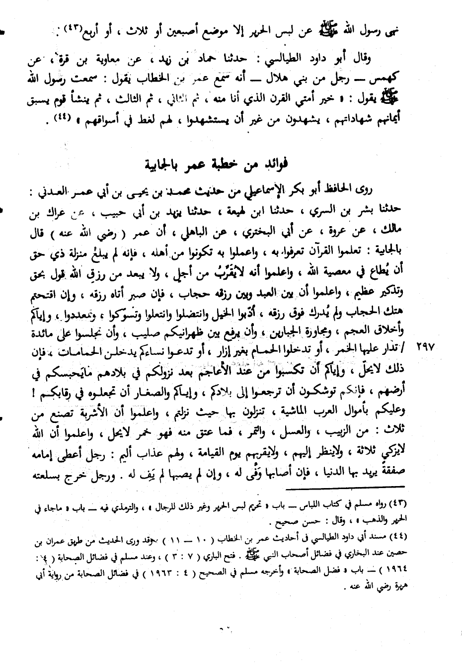 نهى رسول الله صلى الله عليه وسلم عن ليس الحرير الا موضع اصبعين او ثلاث او اربع وقال ابو داود الطيالسى حدثنا حماد بن زيد عن معاوية بن قرة عن كهمس رجل من بنى هلال انه سمع عمر بن الخطاب يقول سمعت رسول الله صلى الله عليه وسلم خير امتى القرن الذى انا منه ثم الثانى ثم الثالث ثم ينشأ قوم يسبق ايمانهم شهاداتهم يشهدون من غير ان يستشهدوا لهم لغط فى اسواوقهم فوائد من خطبة عمر بالجابية روى الحافظ ابو بكر الاسماعيلى من حديث محمج بن يحيى بن ابى عمر العدلى حدثنا بشر بن السرى حدثنا يزيد بن ابى حبيب عن عراك بن مالك عن عروة عن ابى البخترى عن الباهلى ان عمر رضى الله عنه قال الجابية تعلموا القرآن تعرفوا به واعلموا به تكونوا من اهله فانه لم يبلغ منزلة ذى حق ان يطاع فى معصية الله واعلموا انه لا يقرب من اجل ولا يبعد من رزق الله قول بحق وتذكير عظيم واعلموا ان بين العبد وبين رزقه حجاب فان صبر اته رزقه وان اقتحتم هتك الحجاب ولم يدرك فوق رزقه ادبوا الخيل وانتضلوا وانتعلوا تسركوا وتمعددوا واياكم واخلاق العجم ومجاورة الجبارين وان يرفع بين ظهرانيكم صليب وان تجلسوا على مائدة تدار عليها الخمر او تدخلوا الحمام بغير ازار او تدعوا نساءكم يدخلن الحمامات فان ذلك لا يحل واياكم ان تكسبوا من عند الاعاجم بعد نزولكم فى بلادهم ما يحسبكم فى ارضهم فانكم توشكون ان ترجعوا الى بلادكم واياكم والصغار ان تجعلوه فى رقابكم وعليكم باموال العرب الماشية تنزلون بها حيث نزلتم واعلموا ان الاشربة تصنع من ثلاث من الزبيب والعسل والتمر فما عتق منه فهو خمر لا يحل واعلموا ان الله لا يزكى ثلاثة ولا ينظر اليهم ولا يقربهم يوم القيامة ولهم عذاب اليم رجل اعطى امامه صفقة يريد بها الدنيا فان اصابها وفى له وان لم يصبها لم يف له ورجل خرج بسلعته