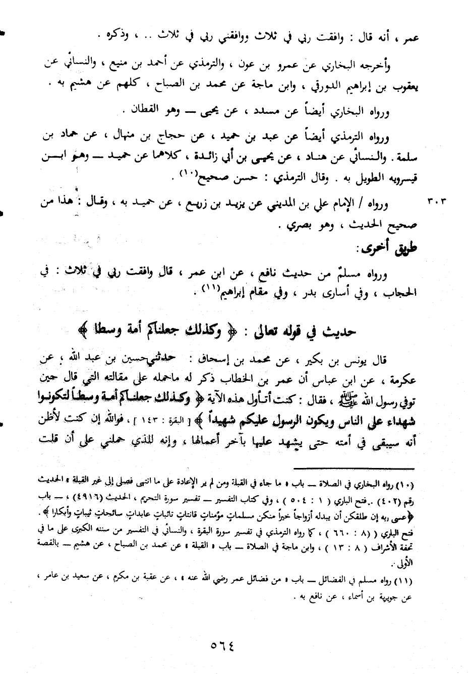 عمر أنه قال وافقت ربي في ثلاث ووافقني في ثلاث وذكره وأخرجه البخاري عن عمرو بن عون والترمذي عن أحمد بن منيع والنسائي عن يعقوب بن إبراهيم الدورقي وابن ماجة عن محمد بن الصباح كلهم عن هشيم به ورواه البخاري أيضا عن مسدد عن يحي وهو القطان ورواه الترمذي أيضا عن عبد بن حميد عن حجاج بن منهال عن حمادبن سلمة والنسائي عن هناد عن يحي بن أبي زائدة كلاهما عن حميد وهو ابن قيسروية الطويل به وقال الترمذي حسن صحيح ورواه الإمام علي بن المديني عن يزيد بن زريع عن حميد به وقال هذا من صحيح الحديث وهو بصري طريق أخرى ورواه مسلم من حديث نافع عن ابن عمر قال وافقت ربي في ثلاث في الحجاب وفي أساري بدر وفي مقام إبراهيم حديث في قوله تعالى وكذلك جعلناكم أمة وسطا قال يونس بن بكير عن محمد بن إسحاق حدثني حسن بن عبد الله عن عكرمة عن ابن عباس أن عمر بن الخطاب ذكرله ما حمله على مقالته التي قال حين توفي رسول الله صلى الله عليه وسلم فقال كنت أتأول هذه الآية وكذلك جعلناكم أمة وسطا لتكونوا شهداء على الناس ويكون الرسول عليكم شهيدا فوالله إن كنت لأظن أنه سيبقى في أمته حتى يشهد عليها بآخر أعمالها وإنه للذي حملني على أن قلت