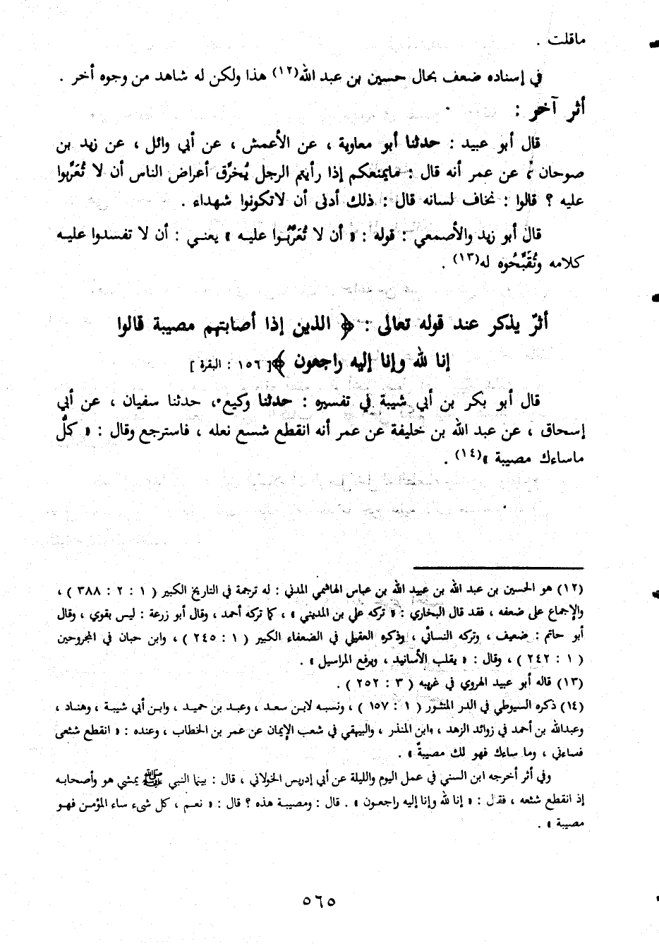 قال أبو عبيد حدثنا أبو معاوية عن الأعمش عن أبي وائل عن يزيد بن صوحان عن عمر أنه قال ما يمنعكم إذا رأيتم يخرّق أعراض الناس أن تعرّبواعليه قالوا نخاف لسانه قال ذلك أدنى أن لا تكونوا شهداء قال ابو زيد والأصمعي قوله أن تعرّبواعليه يعني أن لا تفسدوا عليه كلامه وتقبحوه له أثر يذكر عند قوله تعالى الذين إذا أصابتهم مصيبة قالوا إنا لله وإنا إليه راجعون قال ابو بكر بن أبي شيبة في تفسيره حدثنا وكيع حدثنا سفيان عن أبي إسحاق عن عبد الله بن خليفة عن عمر أنه انقطع شسع نعله فاسترجع وقال كلّ ما ساءك مصيبة