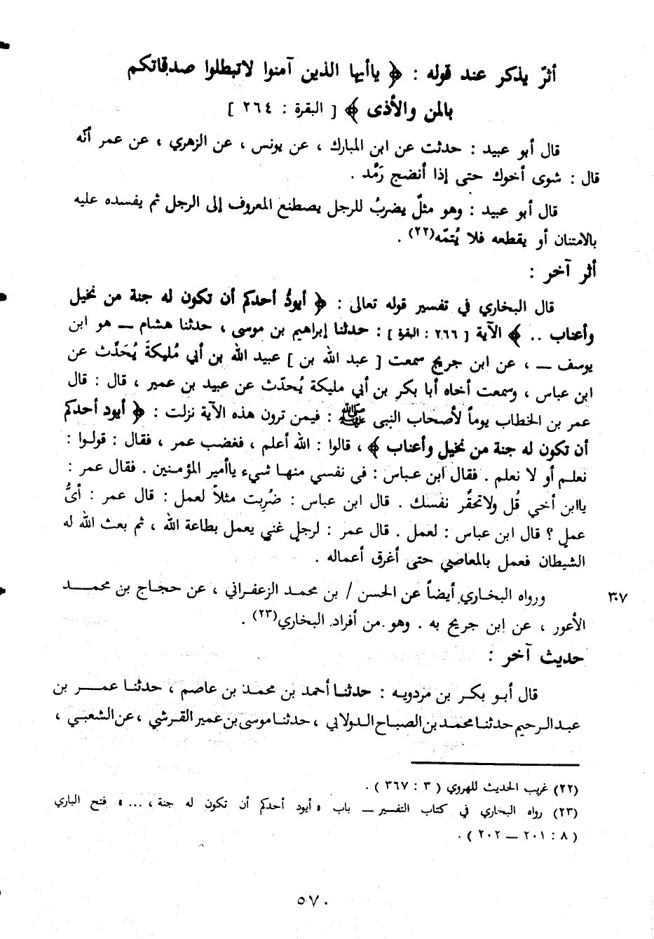 أثر يذكر عند قوله يا أيها الذين آمنو لا تبطلو صدقاتكم بالمن والأذى قال أبو عبيدة حدثت عن ابن المبارك عن يونس عن الزهري عن عمر أنّه قال شوى أخوك حتى إذا أنضج رمّد قال أبو عبيد وهو مثل يضرب للرجل يصطنع المعروف إلى الرجل ثم يفسده عليه بالامتنان أو يقطعه فلا يتمّه أثر آخرقال البخاري في تفسير قوله تعالى أيودّأحدكم أن تكون له جنة من نخيل وأعناب ... حدثنا إبراهيم بن موسى حدثنا هشام هو ابن يوسف عن ابن جريج سمعت عبد الله بن عبيد الله بن أبي مليكة يحدّث عن ابن عباس وسمعت أخاه أبا بكلر بن أبي مليكة يحدّث عن عبيد بن عمير قال قال عمر بن الخطاب يوما لأصحاب النبي صلى الله عليه وسلم فيمن يا ترون هذه الآية نزلت أيودّأحدكم أن تكون له جنة من نخيل وأعناب قالوا الله أعلم فغضب عمر فقال قالوا نعلم أو لانعلم فقال ابن عباس في نفسي منها شيء يا أمير المؤمنين فقال عمر يا ابن أخي قل ولا تحقر نفسك قال ابن عباس ضربت مثلا لعمل قال عمر أيّ عمل قال ابن عباس لعمل قال عمر لرجل غني يعمل بطاعة الله ثم بعث الله له الشيطان فعمل بالمعاصي حتى أغرق أعماله ورواه البخاري أيضا عن الحسن بن محمد الزعفراني عن حجاج بن محمد الاعور عن ابن جريح به وهو من أفراد البخاريحديث آخرقال أبو بكر بن مردوية حدثنا أحمد بن عاصم حدثنا عمر بن عبد الرحيم حدثنا محمد بن الصباح الدولابي حدثنا موسى بن عمير القرشي عن الشعبي