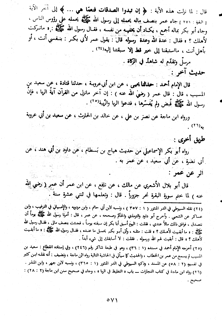 قال لما نزلت هذه الآية إن تبدوا الصدقات فنعمّا هي ... إلى أخر الآية جاء عمر بنصف ماله يحمله إلى رسول الله صلى الله عليه وسلم يحمله على رؤوس الناس وجاء أبو بكر بماله أجمع يكاد أن يخفيه من نفسه فقال رسول الله صلى الله عليه وسلم ما تركت لأهلك فقال عدة الله وعدة رسوله قال يقول عمر لأبي بكر بنفسي أنت أو بأهلي ما استبقنا إلى خير قط إلا سبقتنا إليه مرسل وتقدم له شلهد في الزكاة حديث آخر قال الإمام أحمد حدثنا يحي عن ابن أبي عروبة حدثنا قتادة عن سعيد بن المسيب قال قال عمر رضي الله عنه إن آخر ما نزل من القرآن آية الربا فإنّ رسول الله صلى الله عليه وسلم قبض ولم يفسّرها فدعوا الربا والريّبة ورواه ابن ماجة عن نصر بن علي عن خالد بن الحارث عن سعيد بن عروبة بهطريق أخرىرواه أبو بكر الإسماعيلي من حديث هياج بن بسطام عن داود بن أبي هند عن أبي نضرة عن أيي سعيد عن عمر بهأثر عمرقال أبو بلال الأشعري عن مالك عن نافع عن ابن عمر أن عمر رضي الله عنه لما ختم سورة البقرة نحر جزورا قال وتعلمها في ثنتي عشرة سنة