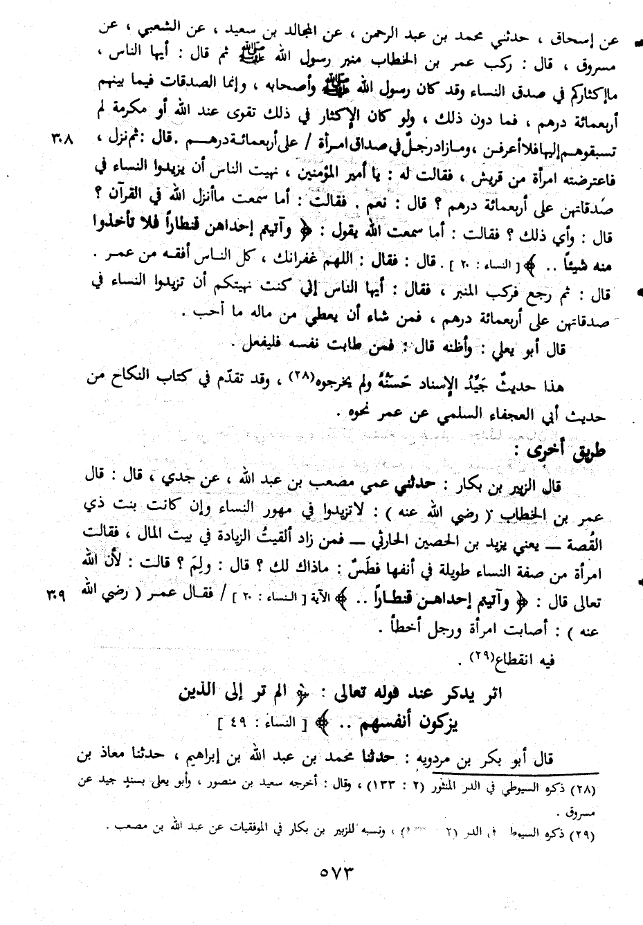 إسحاق حدثني محمد بن عبد الرحمن عن المجالدبن سعيد عن الشعبي عن مسروق قال ركب عمر بن الخطاب منبر رسول الله صلى الله عليه وسلم ثم قال أيها الناس ما إكثاركم في صدق النساء وقد كان رسول الله صلى الله عليه وسلم وأصحابه وإنما الصدقات فيما بينهم أربعمائة درهم فما دون ذلك ولو كان الإكثار في ذلك تقوى عند الله أو مكرمة لم تسبقوهم إليها فلا أعرفن وما زاد رجل في صداق امرأة على أربعمائة درهم قال ثم نزل فاعترضته امرأة من قريش فقالت له يا أمير المؤمنين نهيت الناس أن يزيدوا النساء في صدقاتهن على اربعمائة درهم قال نعم فقالت أما سمعت ما أنزل الله في القرآن قال وأي ذلك فقالت أما سمعت الله يقول واتيتم إحداهن قنطارا فلا تأخذوا منه شيئا قال فقال اللهم غفرانك كل الناس أفقه من عمر قال ثم رجع فركب المنبر فقال أيها الناس إني كنت نهيتكم أن تزيدوا النساء في صدقاتهن على اربعمائة درهم فمن شاء أن يعطي من ماله ما أحب قال أبو يعلي وأظنه قال فمن طابت نفسه فليفعل هذا حديث جيّد الإسناد حسنه ولم يخرجوه وقد تقدّم في كتاب النكاح من حديث أبي العجفاء السلمي عن عمر نحوه طريق أخرى قال الزبير بن بكار حدثني عمي مصعب بن عبد الله عن جدي قال قال عمر بن الخطاب رضي الله عنه لا تزيدوا في مهور النساء وإن كانت بنت ذي القُصة يعني يزيد بن الحصين الحارثي فمن زاد ألقيتُ الزيادة في بيت المال فقالت امرأة من صفة النساء طويلة في أنفها فطس ما ذاك لك قال ولِمَ قالت لأن الله تعالى قال واتيتم إحداهن قنطاراً فقال عمر رضي الله عنه أصابت امرأة وأخطأ عمر
