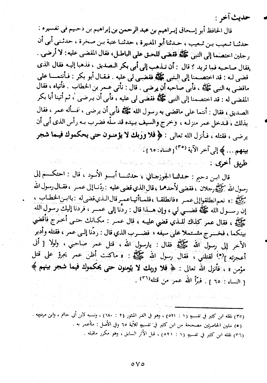 حديث آخر قال الحافظ ابو إسحاق إبراهيم بن عبد الرحمن بن إبراهيم بن دحيم في تفسيره جدثنا شعيب بن شعيب حدثنا أبو المغيرة حدثنا عتبة بن صخرة حدثني أبى أن رجلين اختصما على النبي صلى الله عليه وسلم فقضي للحق على الباطل فقال المقتضى عليه لا أرضى فقال صاحبه فما تريد قال أن نذهب إلى أبي بكر الصديق فذهبا إليه فقال الذي قضى له قد اختصمنا الى النبي صلى الله عليه وسلم فقضى عليه فقال أبو بكر فأنتما على ما قضى به النبي صلى الله عليه وسلم فأبى صاحبه أن يرضى قال نأتي عمر بن الخطاب فأتياه فقال المقضى له قد اختصمنا الى النبي صلى الله عليه وسلم فقضى عليه فأبى أن يرضى ثم أتينا أبا بكر الصديق فقال أنتما على ما قضى رسول الله صلى الله عليه وسلم فأبى ان يرضى فسأله عمر بذلك فدخل عمر منزله وخرج والسيف بيده قد سلّه فضرب به رأس الذي أبى أن يرضى فقتله فأنزل الله تعالى فلا وربك لا يؤمنون حتى يحكموك فيما شجر بينهم فبرا الله عمر من قتله طريق أخرى قال ابن دحيم حدثنا الجوزجاني حدثنا أبو اسود قال احتكم إلى رسول الله صلى الله عليه وسلم رجلان فقضى لأحدهما قال الذي قضى عليه ردنّا إلى عمر فقال رسول الله صلى الله عليه وسلم نعم إنطلقوا إلى عمر فانطلقا فلما أتيا عمر قال الذي قضى له يا ابن الخطاب إن رسول الله صلى الله عليه وسلم قضى لي وإن هذا قال ردنّا إلى عمر فردنا إليك رسول الله صلى الله عليه وسلم فقال عمر كذالك للذي قضى عليه قال عمر مكتنك حتى أخرج فأقضى بينكما فخرج مشتملا على سيفه فضرب الذي قال ردنّا إلى عمر فقتله