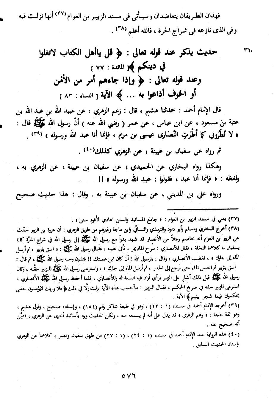 فهذان الطريقان يتعاضذان وسيأتي في مسند الزبير بن العوام أنها نزلت فيه والذي نازعه في شراج الحرة فالله أعلم حديث يذكر عند قوله تعالى قل يأهل الكتاب لا تغلو في دينكم وعند قوله تعالى وإذا جاءهم أمر من الأمن او الخوف أذاعو به قال الإمام أحمد حدثنا هشيه قال زعم الزهري عن عبيد الله بن عبد الله بن عتبة بن مسعود عن ابن عباس عن عمر رضى الله عنه ان رسول الله صلى الله عليه وسلم قال لا تُطروني كما أطرت النصارى عيسى بن مريم فإنا عبد الله ورسوله ثم رواه عن سفيان بن عيينة عن الزهري كذلك وهكذا رواه البخاري عن الحميدي عن سفيان بن عيينة عن الزهري به ولفظه فإنما أنا عبد الله فقولوا عبد الله ورسوله ورواه علي بن المديني عن سفيان بن عيينة به وقال هذا حديث صحيح