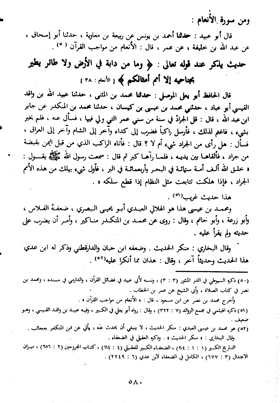 ومن سورة الأنعام قال أبو عبيدة حدثنا أحمد بن يونس عن ربيعة بن معاوية حدثنا أبو إسحاق عن عبد الله بن خليفة عن عمر قال الأنعام من مواجب القرآن حديث يذكر عند قوله تعالى وما من دابة في الأرض ولا طائر يطير بجناحيه إلا أمم أمثالكم قال الحافظ بن يعلى الموصلي حدثنا محمد بن المثني حدثنا عبيد الله بن واقد القيسي أبو عباد حدثني محمد بن عيسى بن كيسان حدثنا محمد بن المنكدر عن جابر ابن عبد الله قال قل الجراد في سنة من ستي عمر التي ولى فيها فسأل عنه فلم يخبر بشيء فاغتنم لذلكفأرسل راكبا فضرب إلى كداء إلى الشام وآخر إلى العراق فسأل هل رأى الجراد شيء أم لا قال فأتاه الراكب الذي من قبل اليمن بقبضة من الجراد فألقاها في يديه فلما رآها كبر ثم قال سمعت رسول الله صلى الله عليه وسلم يقول خلق الله ألف أمة ستمائة في البحر وأربعمائة في البر فأول شيء يهلك من الأمم الجراد فإذا هلكت تتابعت مثل النظام اذا قطع سلكه هذا حديث غريب ومحمد بن عيسى هذا الهلالي العبدي أبو يحي البصري ضعفه الفلاس وأبو زرعة وأبو حاتم وقال روى عن محمد بن المنكدر مناكير وأمر أن يضرب على حديثه ولم يقرأعليه وقال البخاري منكر الحديث وضعفه ابن حبان والدارقطني وذكر له هذا الحديث وحديثا آخر وقال هذان مما أنكرا عليه