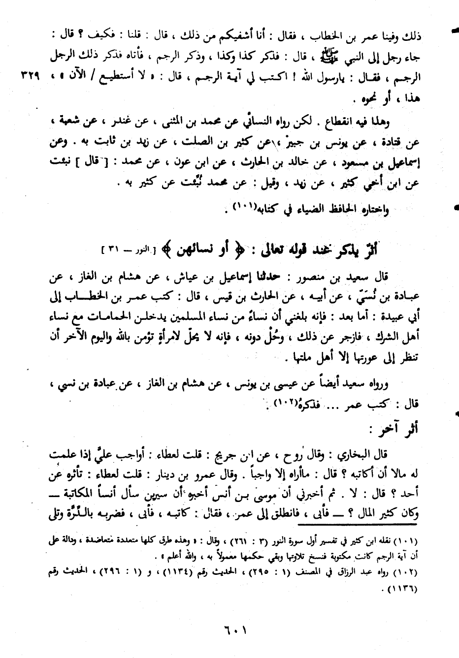 ذلك وفينا عمر بن الخطاب فقال أنا أشفيكم من ذلك قال قلنا فكيف قال جاء رجل إلى النبي صلى الله عليه وسلم قال كذا وكذا وذكر الرجم فأتاه فذكر ذلك الرجل الرجم فقال يا رسول الله اكتب لي آية الرجم قال لا أستطيع الآن هذا أو نحوه وهذا فيه انقطاع لكن رواه النسائي عن محمد بن المثنى عن غندر عن شعبة عن قتادة عن يونس بن جبير عن كثير بن الصلت عن زيد بن ثابت به وعن إسماعيل بن مسعود عن خالد بن الحارث عن ابن عون عن محمد قال نبئت عن ابن أخي كثير به واختاره الحافظ الضياء في كتابه أثر يذكر عند قوله تعالى أو النسائهن قال سعيد بن منصور حدثنا إسماعيل بن عياش عن هشام بن الغاز عن عبادة بن نسيّ عن أبيه عن الحارث بن قيس قال كتب عمر بن الخطاب إلى أبي عبيدة أما بعد فإنه بلغني أن نساء من نساء المسلمين يدخلن الحمامات مع نساء أهل الشرك فازجر عن ذلك وحل دونه فإنه لا يحل لامرأة تؤمن بالله واليوم الآخر أن تنظر إلى عورتها إلا أهل ملتها