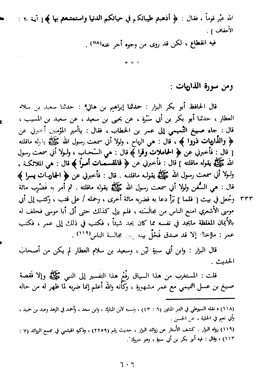 ومن سورة الذاريات قال الحافظ ابو بكر بن أبي التّميمي إلى عمر بن الخطاب فقال يا أمير المؤمنين أخبرني عن والذرايات ذروا قال هي الرياح ولولا سمعت رسول الله صلى الله عليه وسلم يقوله ما قلته قال فأخبرني عن الحاملات وقرا قال هي السّحاب ولولا سمعت رسول الله صلى الله عليه وسلم يقوله ما قلته قال فأخبرني عن المقسمات أمرا قال هي الملائكة ولولا سمعت رسول الله صلى الله عليه وسلم يقوله ما قلته قال فأخبرني عن الجاريات يسرا قال هي السّفن ولولا سمعت رسول الله صلى الله عليه وسلم يقوله ما قلته ثم أمر به فضرب مائة ضربة وجعل في بيت فلما برأدعا به فضربه مائة أخرى وحمله على قتب وكتب إلى أبي موسى الأشعري امنع الناس من مجالسته فلم يزل كذلك حتى اتى أبا موسى فحلف له بالإيمان المغلظة ما يجد في نفسه ما كان يجد شيئا فكتب في ذلم الى عمر فكتب عمر ما إخاله إلا صدق فخل ّبينه وبين مجالسه الناس قال البزار وابن أبي سيرة لّين وسعيد بن سلام العطار لم يكن من أصحاب الحديث قلت المستغرب من هذا السياق رفع هذا التفسير الى النبي صلى الله عليه وسلم وإلا فقصة صبيغ بن عسل التميمي مع عمر مشهورة وكأنه والله أعلم إنما ضربه لما ظهر له حاله