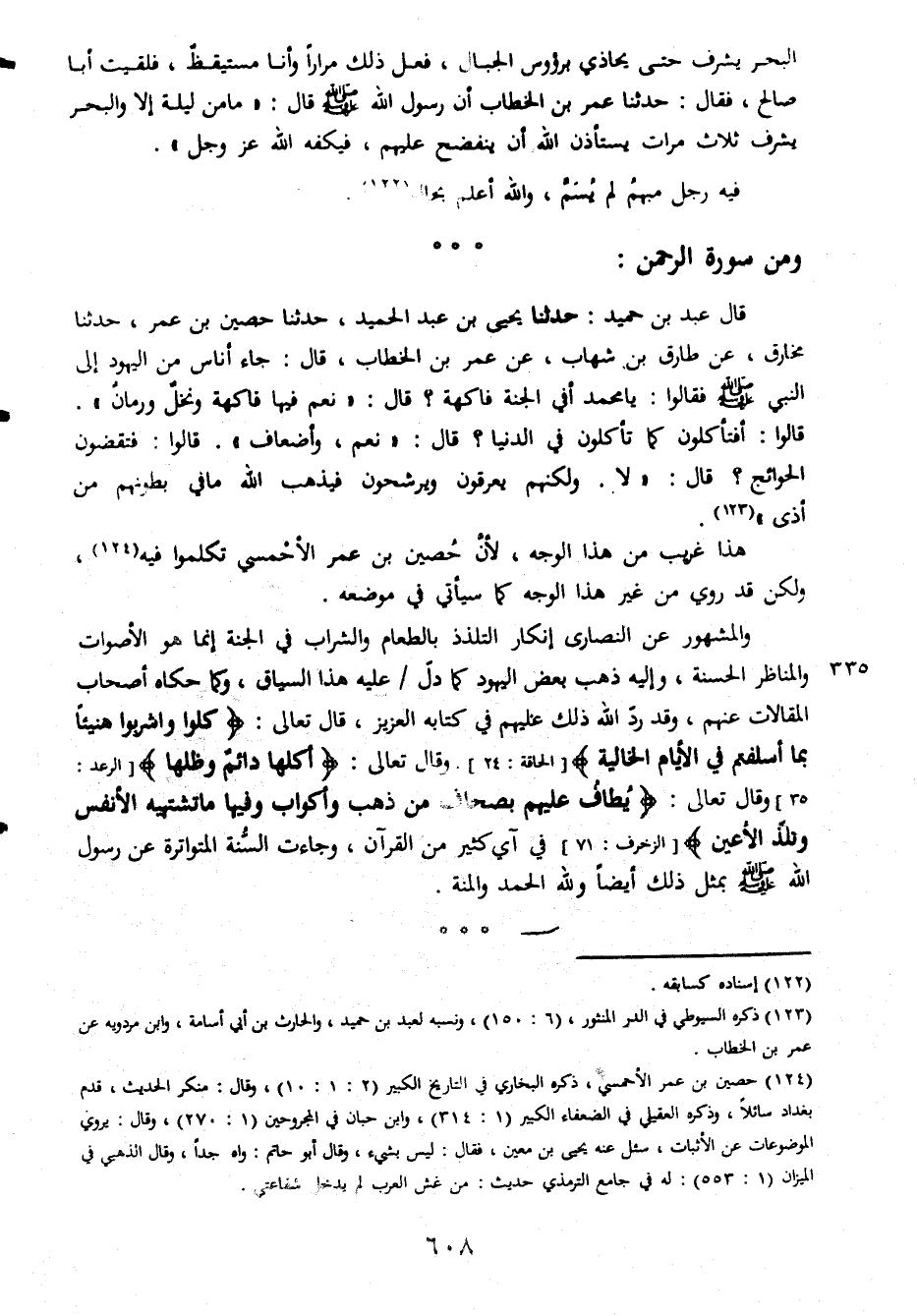 البحر يشرف حتى يحاذي برؤوس الجبال فعل ذلك مرارا وأنا مستيقظ فلقيت أبا صالح فقال حدثنا عمر بن الخطاب أن رسول الله قال مامن ليلة إلا والبحر يشرف ثلاث مرات يسأذن الله أن ينفضح عليهم فيكفه الله عز وجل فيه رجل مبهم لم يسمّ والله أعلم بحاله ومن سورة الرحمن قال عبد بن حميد حدثنا يحي بن عبد الحميد حدثنا حصين بن عمر حدثنا مخارق عن طارق بن شهاب عن عمر بن الخطاب قال جاء أناس من اليهود إلى النبي صلى الله عليه وسلم فقالوا يا محمد أفي الجنة فاكهة قال نعم فيها فاكهة ونخل ورمان قالوا أفتأكلون كما تأكلون في الدنيا قال نعم وأضعاف قالوا فتقضون الحوائج قال لا ولكنهم يعرقون ويرشحون فيذهب الله ما في بطونهم من أذى هذا غريب من هذا الوجه لأنّ حصين بن عمر الأحمسي تكلموا فيه ولكن قد روي من غير هذا الوجه كما سيأتي في موضعه والمشهور عن النصارى إنكار التلذذ بالطعام والشراب في الجنة إنما هو الأصوات والمناظر الحسنة وإليه ذهب بعض اليهود كما دل عليه السياق وكما حكاه أصحاب المقالات عنهم وقد ردّ الله ذلك عليهم في كتابه العزيز كلوا واشربوا هنيئا بما أسلفتم في الأيام الخالية وقال تعالى أكلها دائم وظلها وقال تعالى يطاف عليهم بصحاف من ذهب وأكواب وفيه ما تشتهيه الأنفس وتلذّ العين في آي كثير من القرآن وجاءت السنة المتواترة عن رسول الله صلى الله عليه وسلم بمثل ذلك أيضا ولله الحمد والمنة