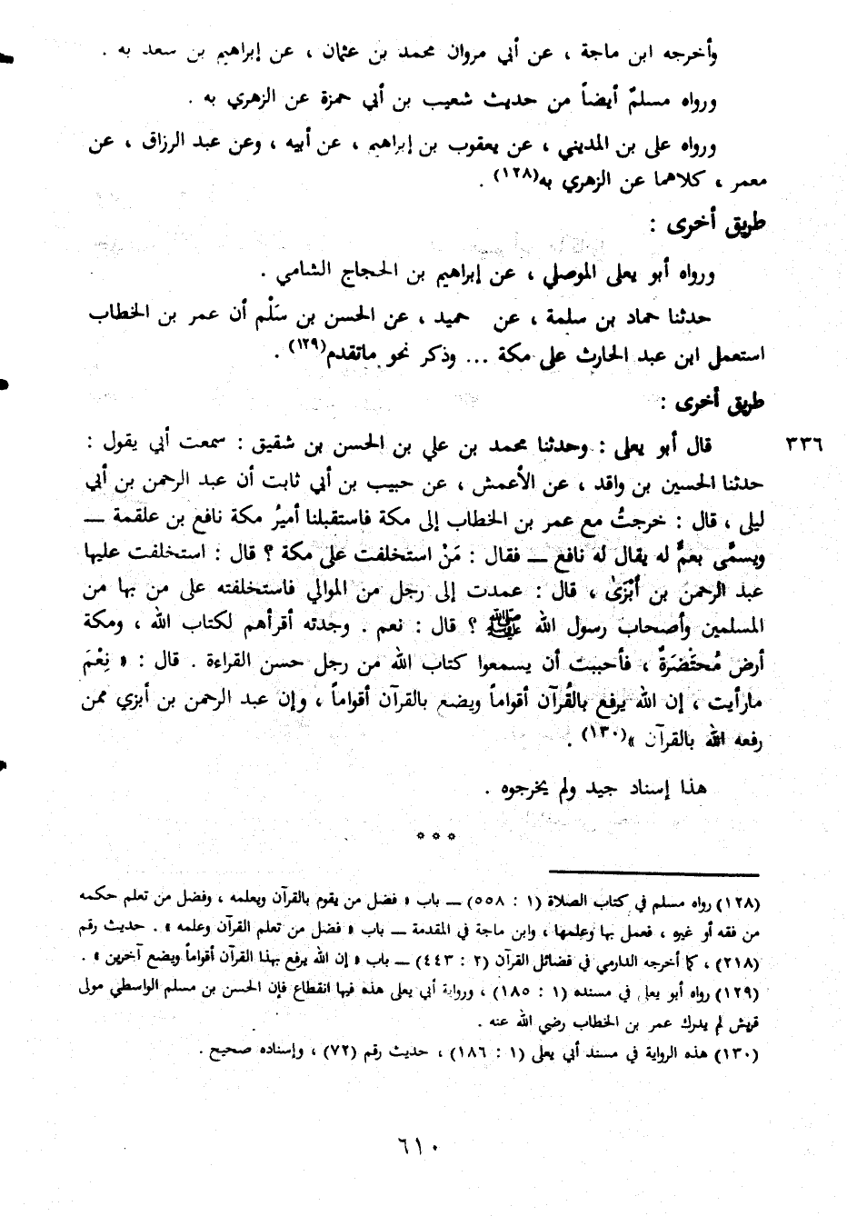 وأخرجه ابن ماجة عن أبي مروان محمد بن عثمان عن إبراهيم بن سعد به ورواه مسلم أيضا من حديث شعيب بن أبي حمزة عن الزهري به ورواه علي بن الميني عن يعقوب بن إبراهيم عن أبيه وعن عبد الرزاق عن معمر كلاهما عن الزهري به طريق أخرى ورواه أبو يعلي وحدثنا محمد بن علي بن الحسن بن شقيق سمعت أبي يقول حدثنا الحسين بن واقد عن الأعمش عن حبيب بن أبي ثابت أن عبد الرحمن بن أبي ليلى قال خرجت مع عمر بن الخطاب إلى مكة فاستقبلنا أمير مكة نافع بن علقمة ويسمى بعمّ له يقال له نافع فقال من استخلفت على مكة قال استخلفت عليها عبد الرحمن بن أبزى قال عمدت إلى رجل من الموالي فاستخلفته على من بها من المسلمين وأصحاب رسول الله صلى الله عليه وسلم قال نعم وجدته أقرأهم لكتاب الله ومكة أرض محتضرة فأحببت أن يسمعوا كتاب الله من رجل حسن القراءة قال نعم ما رأيت إن الله يرفع بالقرآن أقواما ويضع بالقرآن أقواما وإن عبد الرحمن بن أبزي ممن رفعه الله تعالى هذا إسناد جيد ولم يخرجوه