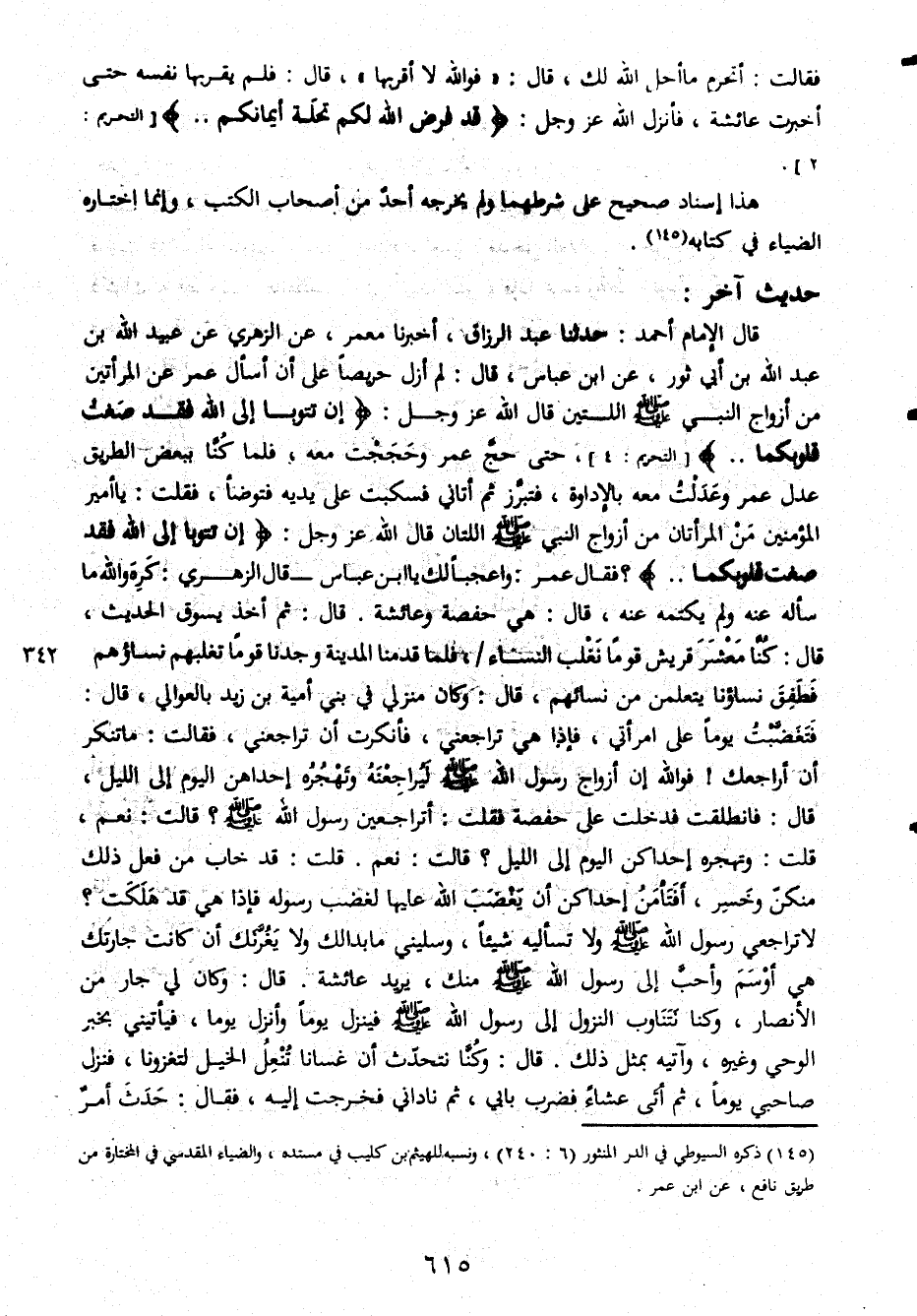 فقالت أتحرم ما أحل الله لك قال فوالله لا أقربها قال فلم يقربها نفسه حتى أخبرت عائشة فأنزل الله عز وجل قد فرض الله لكم تحلّة أيمانكم هذا إسناد صحيح على شريطهما ولم يخرجه أحد من اصحاب الكتب وإنما اختاره الضياء في كتابه حديث آخر قال الإمام أحمد حدثنا عبد الرزاق أخبرنا معمر عن الزهري عن عبيد الله بن عبد الله بن أبي ثور عن ابن عباس قال لم ازل حريصا على أن أسأل عمر عن المرأتين من أزواج النبي صلى الله عليه وسلم اللتين قال الله عز وجل إن تتوبا إلى الله فقد صغت قلوبكما حيى حج عمر وحججت معه فلما كنّا ببعض الطريق عدل عمر وعدلت معه بالاداوة فتبرز ثم أتاني فسكبت على يديه فتوضأ فقلت يا أمير المؤمنين من المرأتان من أزواج النبي صلى الله عليه وسلم اللتان قال الله عز وجل إن تتوبا إلى الله فقد صغت قلوبكما فقال عمر واعجبالك يا ابن عباس قال الزهري كره واله ما سأله عنه ولم يكتمه عنه قال هي حفصة وعائشة قال ثم أخذ يسوق الحديث قال كنّا معشر قريش قوما نغلب النساء فلما قدمنا المدينة وجدنا قوما تغلبهم نساؤهم فطفق نساؤنا يتعلمن من نسائهم قال وكان منزلي في بني أمية بن زيد بالعوالي قال فتغضّبت يوما على امرأتي فإذا هي تراجعني فأنكرت أن تراجعني فقالت ما تنكر أن أراجعك فوالله إن أزواج رسول الله صلى الله عليه وسلم ليرجعنه وتهجره إحداهن اليوم إلى الليل قال فانطلقت فدخلت على حفصة فقلت أتراجعين رسول الله صلى الله عليه وسلم قالت نعم قلت وتهجره إحداكن اليوم إلى الليل قالت نعم قلت قد خاب من فعل ذلك منكنّ وخسر أفتأمن إحداكن أن يغضب الله عليها لغضب رسوله فإذا هي قد هلكت لا تراجعي رسول الله صلى الله عليه وسلم ولا تسأليه شيئا وسليني ما بدالك ولا يغرنك أن كانت جارتك هي أوسم واحب إلى رسول الله صلى الله عليه وسلم منك يريد عائشة قال وكان لي جار من الأنصار وكنا نتناوب النزول إلى رسول الله صلى الله عليه وسلم فينزل يوما وأنزل يوما فياتيني بخبر الوحي وغيره وآتيه بمثل ذلك قال كنا نتحدث أن غسانا تنعل الخيل لتغزونا فنزل صاحبي يوماثم أتى عشاء فضرب بابي ثم ناداني فخرجت إليه فقال حدث أمر