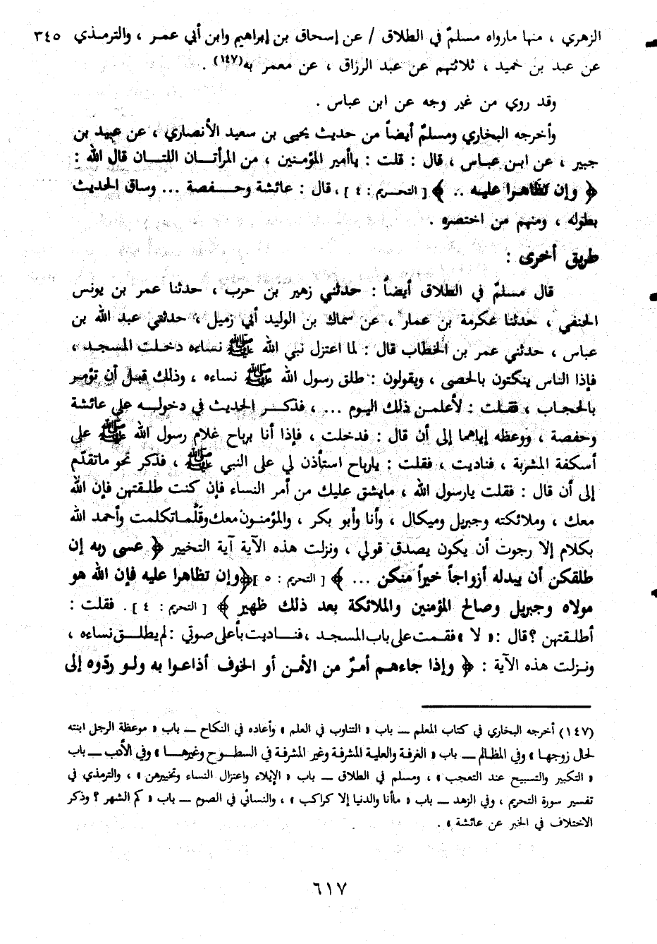 الزهري منها ما رواه مسلم في الطلاق عن إسحاق بن إبراهيم وابن عمر والترمذي عن عبد الحميد ثلاثتهم عن عبد الرزاق عن معمر به وقد روي من غير وجه عن ابن عباس واخرجه البخاري ومسلم أيضا من حديث يحيى بن سعيد الأنصاري عن عبيد بن جبير عن ابن عباس قال قلت ياأمير المؤمنين من المرأتان اللتان قال الله وإن تظاهرا عليه قال عائشة وحفصة وساق الحديث بطوله ومنهم من اختصر