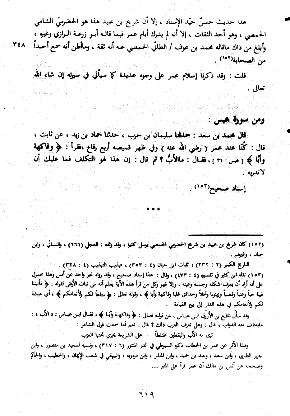 قلت وقد ذكرنا إسلام عمر على وجوه عديدة كما سيأتي في سيرته إن شاء الله تعالى ومن سورة عبس قال محمد بن سعد حدثنا سيلمان بن حرب حدثنا حماد بن زيد عن ثابت قال كنّا عند عمر رضي الله عنه وفي ظهرقميصه أربع رقاع فقرأ وفاكهة وأبّا فقال ما الأبّ ثم قال إن هذا لهو التكلف فما عليك أن لا تدريه إسناد صحيح