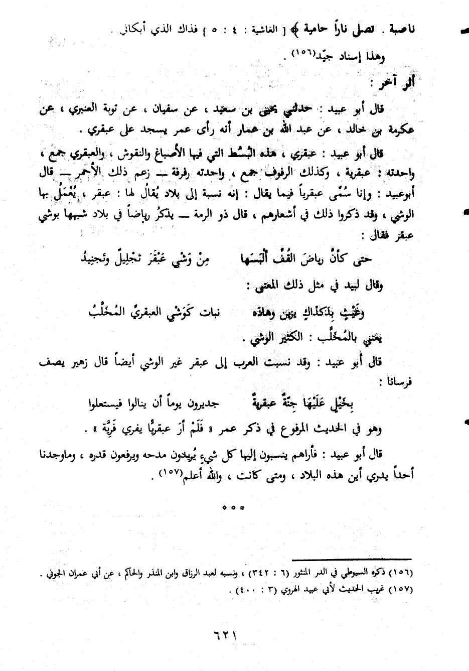 عاملة ناصبة تصلى نارا حامية فذاك الذي أبكاني وهذا إسناد جيد أثر آخر قال أبو عبيد حدثني يحيى بن سعيد عن سفيان عن توبة العنبري عنعكرمة بن خالد عن عبد الله بن عمار أنه رأى عمر يسجد على عبقري قال أبو عبيد عبقري هذه البسط التي فيها الأصباغ والنقوش والعبقري جمع واحدته عبقرية وكذلك الرفوف جمع واحدته رفرفة زعم ذلك الأحمر قال أبو عبيد وإنما سمي عبقريا فيما يقال إنه نسبة إلى بلاد يقال لها عبقر يعمل بها الوشي وقد ذكروا ذلك في أشعارهم قال ذو الرمة يذكر رياضا في بلاد شبهها بوشي عبقر فقال حتى كأن رياض القف ألبسها من وشي عبقر تجليل وتجنيد وقال لبيد في مثل ذلك المعنى وغيث بدكداك يزين وهاده نبات كوشي العبقري المخلب يعني بالمخلب الكثير الوشي قال أبو عبيد وقد نسبت العرب إلى عبقر غير الوشي أيضا قال زهير يصف فرسانا بخيل عليها جنة عبقرية جديرون يوما أن ينالوا فيستعلوا وهوفي الحديث المرفوع في ذكر عمر فلم أر عبقريا يفري فريه قال أبو عبيد فأراهم ينسبون إليها كل شيء يريدون مدحه ويرفعون قدره وماوجدناأحدا يدري أين هذه البلاد ومتى كانت والله أعلم