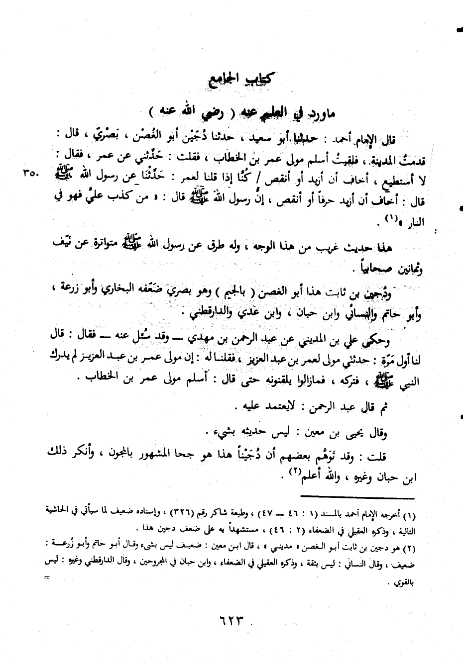 ما ورد في العلم عنه رضي الله عنه قال الإمام أحمد حدثنا أبو سعيد حدثنا دجين أبو الغصن بصري قال قدمت المدينة فلقيت أسلم مولى عمر بن الخطاب فقلت حدثني عن عمر فقال لا أستطيع أخاف أن أزيد أو أنقص كنا إذا قلنا لعمر حدثنا عن رسول الله صلى الله عليه وسلم قال أخاف أن أزيد حرفا او أنقص إن رسول الله صلى الله عليه وسلم قال من كذب علي فهو في النار هذا حديث غريب من هذا الوجه وله طرق عن رسول الله صلى الله عليه وسلم متواترة عن نيف وثمانين صحابيا ودجين بن ثابت هذا أبو الغصن بالجيم وهو بصري ضعفه البخاري وأبو زرعة وأبو حاتم والنسائي وابن حبان وابن عدي والدارقطاني وحكى علي بن المديني عن عبد الرحمن بن مهدي وقد سئل عنه فقال قال لنا أول مرة حدثني مولى لعمر بن عبد العزيز فقلنا له إن مولى عمر بن عبد العزيز لم يدرك النبي صلى الله عليه وسلم فتركه فمازالوا يلقنونه حتى قال أسلم مولى عمر بن الخطاب ثم قال عبد الرحمن لايعتمد عليه وقال يحيى بن معين ليس حديثه بشيء قلت وقد توهم بعضهم أن دجينا هذا هو جحا المشهور بالمجون وأنكر ذلك ابن حبان وغيره والله أعلم