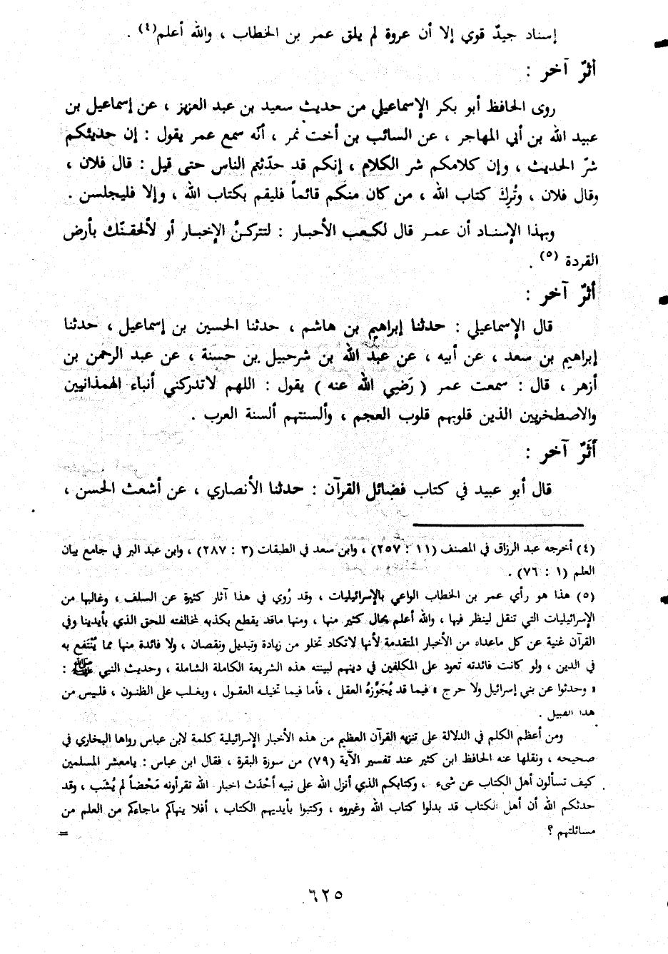 إسناد جيد وقوي غلا أن عروة لم يلق عمر بن الخطاب والله أعلم أثر آخر روى الحافظ أبو بكر الإسماعيلي من سعيد بن عبد العزيز عن إسماعيل بن عبيد الله بن أبي المهاجر عن السائب بن أخت نمر أنه سمع عمر يقول إن حديثكم شر الحديث وإن كلامكم شر الكلام إنكم قد حدثتم الناس حتى قيل قال فلان وقال فلان وترك كتاب الله من كان منكم قائما فليقم بكتاب الله وإلا فليجلسن وبهذا الإسناد أن عمر قال لكعب الأحبار لتتركن الإخبار أو لألحقنك بأرض القردة أثر آخر قال الإسماعيلي حدثنا إبراهيم بن هاشم حدثنا الحسين بن إسماعيل حدثنا إبراهيم بن سعد عن أبيه عن عبد الله بن شرحبيل بن حسنة عن عبد الرحمن بن أزهر قال سمعت عمر رضي الله عنه يقول اللهم لا تدركني أنباء الهمذانيين والاصطخريين الذين قلوبهم قلوب العجم وألسنتهم ألسنة العرب أثر آخر قال أبو عبيد في كتاب فضائل القرآن حدثنا الأنصاري عن أشعث الحسن