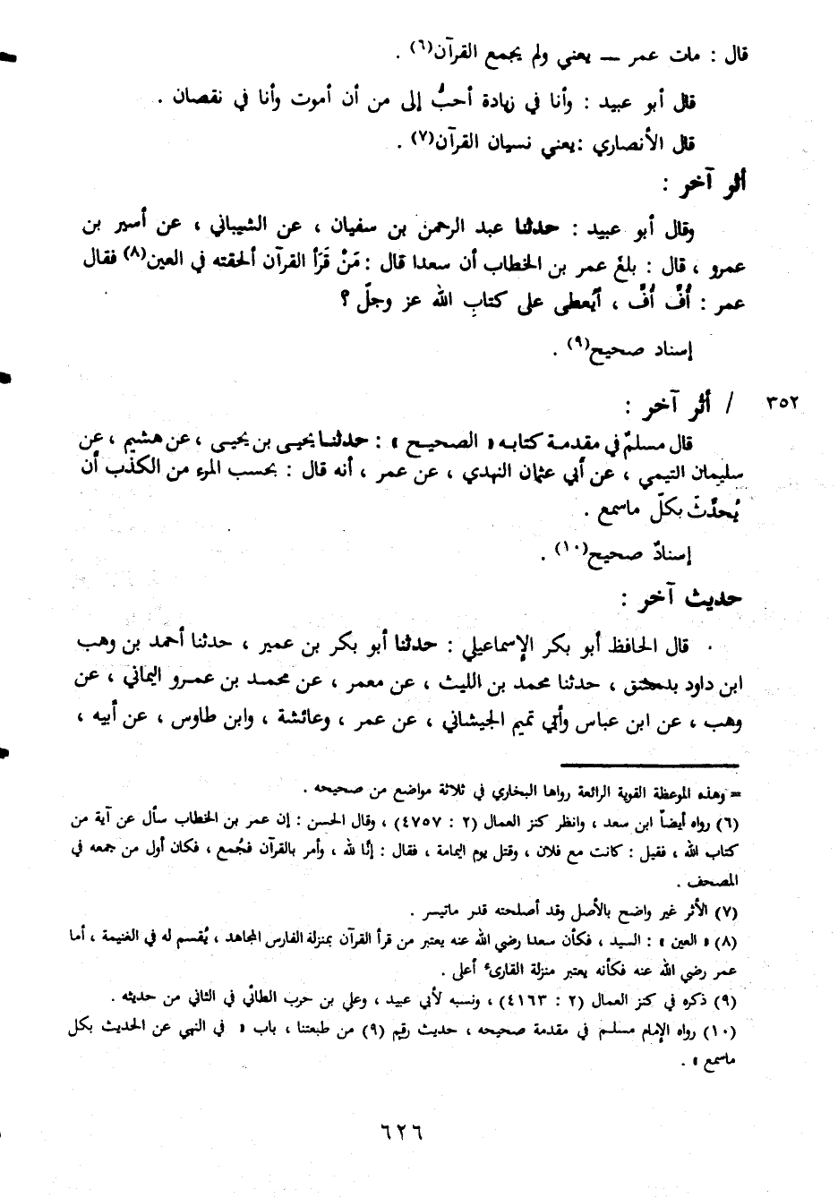 قال مات عمر يعني ولم يجمع القرآن قال أبو عبيد وأنا في زيادة أحب إلي من أموت وأنا في نقصان قال الأنصاري يعني نسيان القرآن أثر آخر وقال أبو عبيد حدثنا عبد الرحمن بن سفيان عن الشيباني عن أسير بن عمرو قال بلغ عمر بن الخطاب أن سعدا قال من قرأ القرآن ألحقته في العين فقال عمر أف أف أيعطى على كتاب الله إسناد صحيح أثر آخر قال مسلم في مقدمة كتابه الصحيح حدثنا يحيى بن يحيى عن هشيم عن سليمان التيمي عن أبي عثمان النهدي عن عمر أنه قال بحسب المرء من الكذب أن يحدث بكل ما سمع إسناد صحيح حديث آخر قال الحافظ أبو بكر الإسماعيلي حدثنا أبو بكر بن عمير حدثنا أحمد بن وهب ابن داود بدمشق حدثنا محمد بن الليث عن عمر عن محمد بن عمرو ليماني عن وهب عن ابن عباس وأبي تميم الجيشاني عن عمر وعائشة وابن طاوس عن أبيه