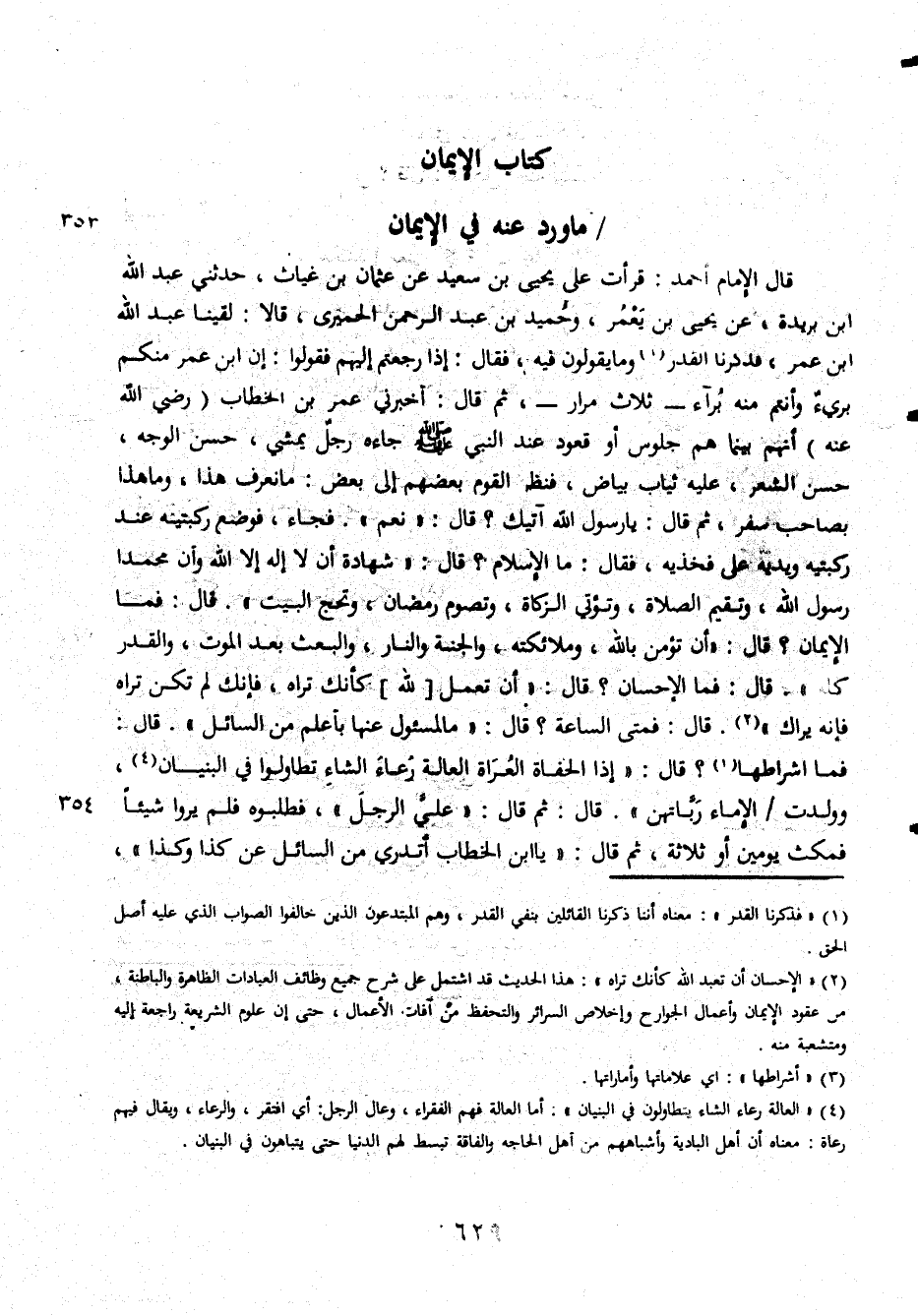 ما ورد عنه في الإيمان قال الإمام أحمد قرأت على يحيى بن سعيد عن عثمان بن غياث حدثني عبد الله ابن بريدة عن يحيى بن يعمر وحميد بن عبد الرحمن الحميري قالا لقينا عبد الله ابن عمر فذكرنا القدر وما يقولون فيه فقال إذا رجعتم إليهم فقولوا إن ابن عمر منكم بريء وأنتم منه برآء ثلاث مرار ثم قال أخبرني عمر بن الخطاب رضي الله عنه أنهم بينما هم جلوس أو قعود عند النبي صلى الله عليه وسلم جاء رجل يمشي حسن الوجه حسن الشعر عليه ثياب بياض فنظر القوم بعضهم إلى بعض ما نعرف هذا وبهذا بصاحب سفر ثم قال يارسول الله آتيك قال نعم فجاء فوضع ركبتيه عند ركبتيه ويديه على فخذيه فقال ما الإسلام قال شهادة أن لاإله إلا الله وأن محمدا رسول الله وتقيم الصلاة وتؤتي الزكاة وتصوم رمضان وتحج البيت قال فما الإيمان قال أن تؤمن بالله وملائكته والجنة والنار والبعث بعد الموت والقدر كله قال فما الإحسان قال أن تعمل لله كأنك تراه فإنك لم تكن تراهفإنه يراك قال فمتى الساعة قال مالمسئول عنها بأعلم من السائل قال فما أشراطها قال إذا الحفاة العراة رعاء الشاء تطاولوا في البنيان وولدت الإماء رباتهن قال ثم قال علي الرجل فطلبوه فلم يروا شيئا فمكث يومين أو ثلاثة ثم قال ياابن الخطاب أتدري من السائل عن كذا وكذا