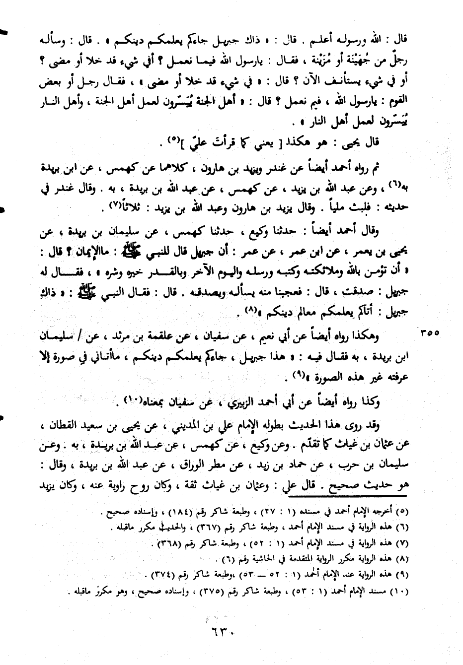 قال الله ورسوله أعلم قال ذاك جبريل جاءكم يعلمكم دينكم قال وسأله رجل من جهينة أو مزينة فقال يارسول الله فيما نعمل أفي شيء قد خلا أو مضى أو في شيء يستأنف الآن قال في شيء قد خلا أو مضى فقال رجل أو بعض القوم يا رسول الله فيم نعملقال أهل الجنة ييسرون لعمل أهل الجنة وأهل النار ييسرون لعمل أهل النار قال يحيى هو هكذا يعني كما قرأت عليّ ثم رواه أحمد أيضا عن غندر ويزيد بن هارون كلامها عن كهمس عن ابن بريدة به وعن عبد الله بن زيد عن كهمس عن عبد الله بن بريدة به وقال غندر في حديثه فلبث مليا وقال يزيد بن هارون وعبد الله بن يزيد ثلاثا وقال أحمد أيضا حدثنا وكيع حدثنا كهمس عن سليمان بن بريدة عن يحيى بن يعمر عن ابن عمر عن عمر أن جبريل قال النبي صلى الله عليه وسلم ما الإيمان قال أن تؤمن بالله وملائكته وكتبه ورسله واليوم الآخر وبالقدر وبالقدر خيره وشره فقال له جبريل صدقت قال فعجبنا منه يساله ويصدقه قال فقال النبي صلى الله عليه وسلم ذاك جبريل أتاكم يعلمكم معالم دينكم وهكذا رواه أيضا عن أبي نعيم عن سفيان عن علقمة بن مرثد عن سليمان ابن بريدة به فقال فيه هذا جبريل جاءكم يعلمكم دينكم ما أتاني في صورة إلا عرفته غير هذه الصورة وكذا رواه أيضا عن أحمد الزبيري عن سفيان بمعناه وقد روى هذا الحديث بطوله الإمام علي بن المديني عن يحيى بن سعيد القطان عن عثمان بن غياث كما تقدم وعن وكيع عن كهمس عن عبد الله بن بريدة وقال هو حديث صحيح قال علي وعثمان بن غياث ثقة وكان روح رواية عنه وكان يزيد
