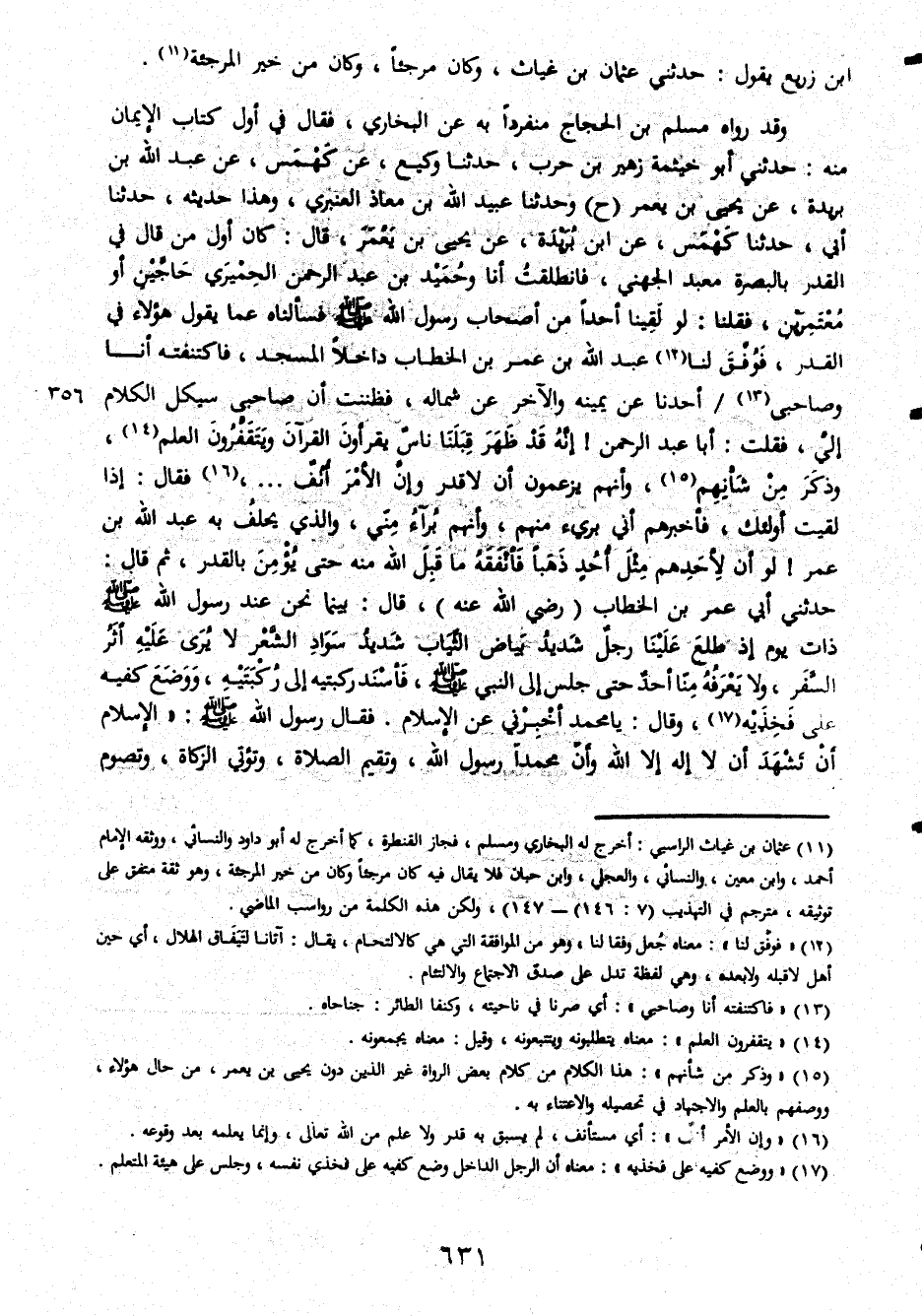 ابن زريع يقول حدثني عثمان بن غياث وكان مرجئا وكان من خير المرجئة وقد رواه مسلم بن الحجاج منفردا به عن البخاري فقال في أول كتاب الإيمان منه حدثني أبو خيثمة زهير بن حرب حدثنا وكيع عن كهمس عن عبد الله بن بريدة عن يحيى بن يعمر قال كان أول من قال في القدر بالبصرة معبد الجهني فانطلقت أنا حميد بن عبد الرحمن الحميري حاجين أو معتمرين فقلنا لو لقينا أحدا من أصحاب رسول الله صلى الله عليه وسلم فسألناه عما يقول هؤلاء في القدر فوفق لنا عبد الله بن عمر بن عمر بن الخطاب داخلا المسجد فاكتنفته أنا وصاحبى أحدنا عن يمينه والآخر عن شماله فظننت أن صاحبى سيكل الكلام إليّ فقلت أبا عبد الرحمن إنه قد ظهر قبلنا ناس يقرأون القرآن ويتقفرون العلم وذكر من شأنهم وأنهم يزعمون أن لا قدر وإنّ الأمر أنف فقال إذا لقيت أولئك فأخبرهم أني بريء منهم وأنهم برآءمنّي والذي يحلف به عبد الله بن عمر لو أن لأحدهم مثل أحد ذهبا فأنفقه ما قبل الله منه حتى يؤمن بالقدر ثم قال حدثني أبي عمر بن الخطاب رضى الله عنه قال بينما نحن عند رسول الله صلى الله عليه وسلم ذات يوم إذ طلع علينا رجل شديد بياض الثياب شديد سواد الشعر لا يرى عليه أثرالسفر ولا يعرفه منّا أحد حتى جلس إلى النبي صلى الله عليه وسلم فأسند ركبته إلى ركبتيه ووضع كفيه على فخذيه وقال رسول الله صلى الله عليه وسلم الإسلام أن تشهد أن لا إله إلا الله وأن محمدا رسول الله وتقيم الصلاة وتؤتي الزكاة وتصوم